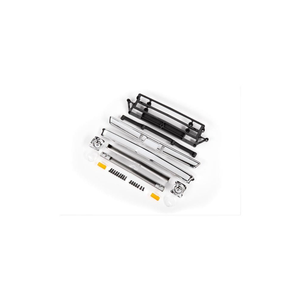 Traxxas karosszéria tartozékok króm - tartalmazza: első hűtőrács (fent/alul), fényszóróházak (bal/jobb), lökhárítók (elöl/hátul), rögzítő tartozékok.