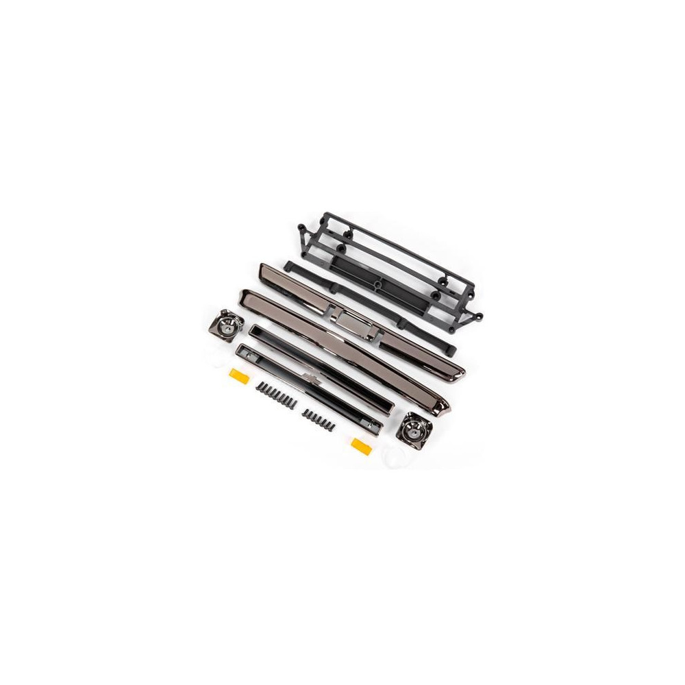 Traxxas karosszéria tartozékok fekete króm - tartalmazza: első hűtőrács (fent/alul), fényszóróházak (bal/jobb), lökhárítók (elöl/hátul), rögzítő tartozékok.