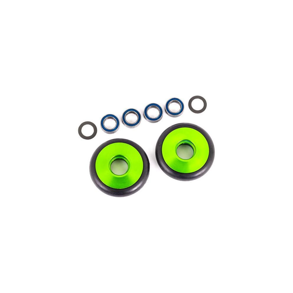 Nagy szilárdságú 6061-T6 alumíniumból készült tuning keréktárcsák zöld eloxált kivitelben, gumigyűrűvel (2 db), 4x golyóscsapágy 5x8x2,5 mm, 2x alátét 5x8x0,3 mm.