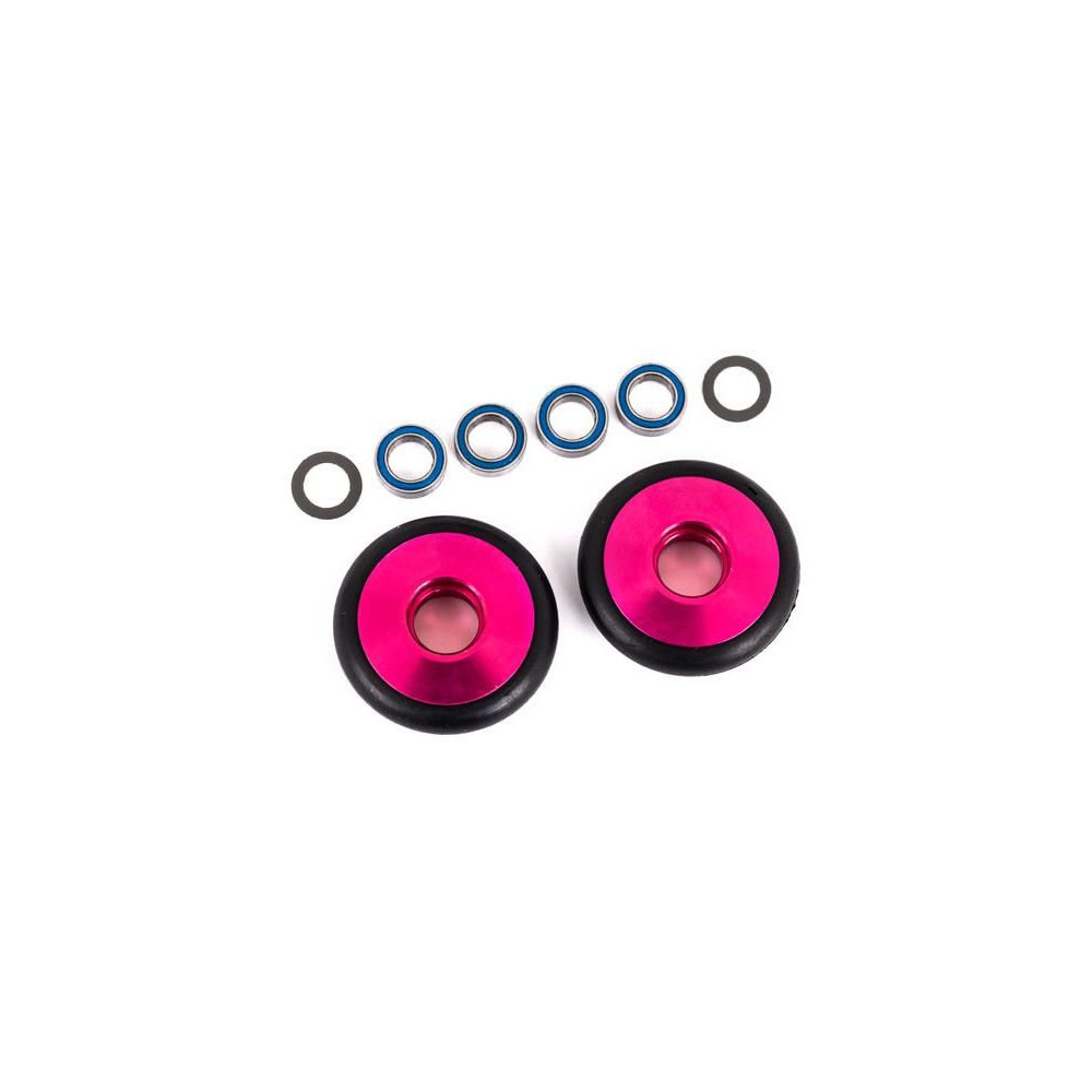 Nagy szilárdságú 6061-T6 alumíniumból készült tuning wheelie kerekek rózsaszín eloxált kivitelben, gumigyűrűvel (2 db), 4x golyóscsapágy 5x8x2,5 mm, 2x alátét 5x8x0,3 mm.