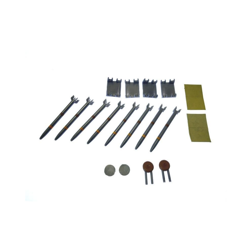 Készlet 8 kis rakétából és 4 hordozóból 2 rakéta számára, kétoldalas ragasztószalaggal. Rakéta méretei: hossza 63 mm, rakéta átmérője kb. 5 mm.