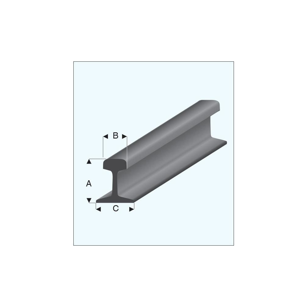 Szürke polisztirol műanyag modell egy vasúti profilról (sín), H0/TT méretarányú. Méretek 2,9 x 1,5 x 2,5 mm (A x B x C), hossza 1 m. 10 db.