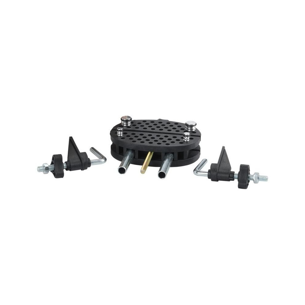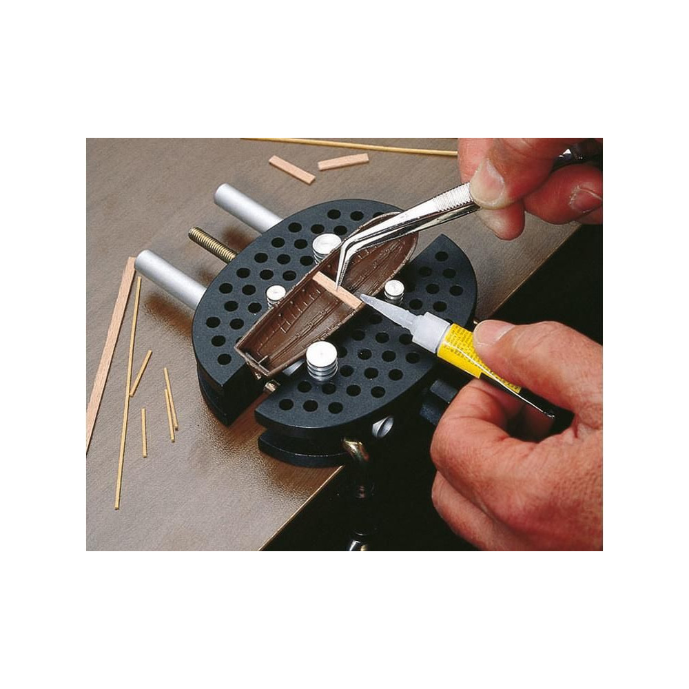 Az állítható csapoknak köszönhetően a praktikus tartó különböző formájú alkatrészek befogadására alkalmas. A tartó két asztali rögzítővel rögzíthető a munkalaphoz.
