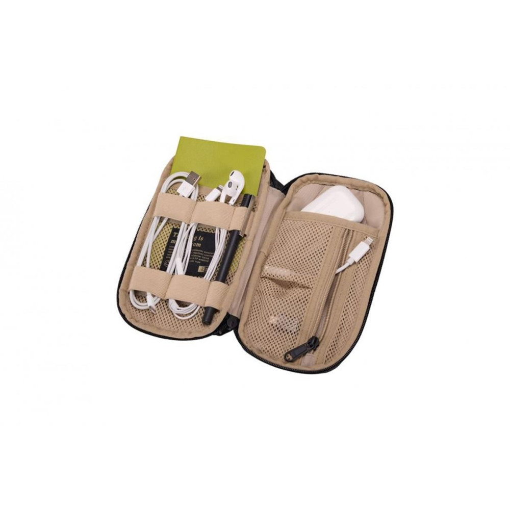A kábelek, adapterek, fejhallgatók és kisebb személyes kiegészítők a különböző biztonságos zsebekben és rugalmas hurkokban rendszerezhetők. Könnyen szállíthatóak a kiegészítők a helytakarékos formának köszönhetően, amely egy nagyobb táskában is elfér. Hosszú élettartamú YKK fém jellemzők, logó és cipzárak.