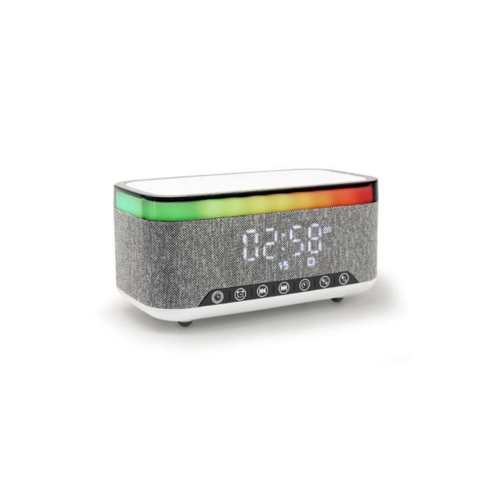 920g Méret: 180 x 100 x 90mm Akkumulátor kapacitás: 1800 mAh Töltési idő: kb. 2-3 óra Teljesítmény: 18W Vezeték nélküli töltő teljesítménye: 15W Bluetooth verzió: 5.3 Bluetooth hatótávolság: 10m Jellemzők: Fehér zaj, óra, ébresztő, LED környezeti fény, TF , FM, AUX, USB.Více informací
