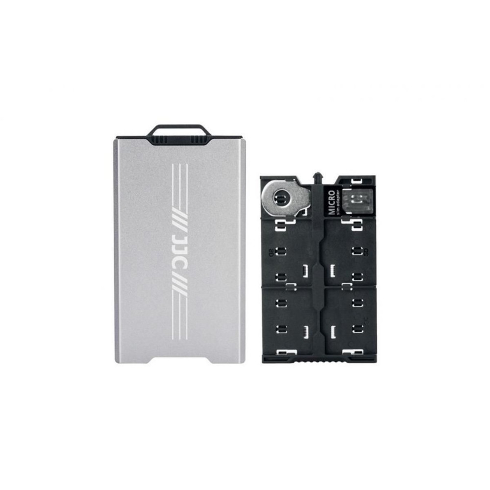 JJC alumínium tok memóriakártyáknak dupla zárral (4 SD + 12 TF + 2 Nano SIM). Anyagok: alumíniumötvözet, szilikon. Súly: 63,4 g. Méretek: 110,4 x 61 x 9,7 mm. 4 SD-kártya, 12 Micro SD-kártya és 2 Nano SIM/NM-kártya tárolására alkalmas.