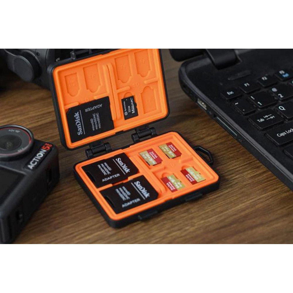 A vízálló memóriakártya-tároló doboz (62 g) egy praktikus és kompakt tok, amely akár 8 SD-kártyát, 14 TF-kártyát és 2 Nano SIM-kártyát is képes tárolni. Vízálló kialakításának köszönhetően megvédi kártyáit a nedvességtől és a sérülésektől. A doboz könnyű és 71,8 x 90 x 16 mm méretű, így ideális megoldást kínál adathordozói rendszerezéséhez és biztonságos tárolásához.