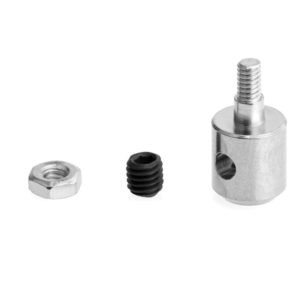 A belső menetes változtatható vég különösen alkalmas olyan esetekben, amikor kevés a hely a szervo és a rúdház között. Csavarozd a rudat vagy a rúd menetes végét közvetlenül a változtatható végbe, növeld a szervokar furatát 2,5 mm-re, és szereld be a végét a szervokarba. A végzáró kupak levehető a karról.