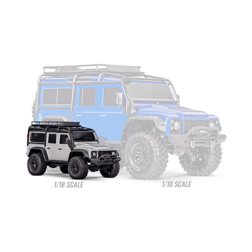 Traxxas TRX-4M Land Rover Defender távirányítású autómodell 1:18 méretarányban, lenyűgöző sokoldalúsággal és képességekkel. Fém alváz 4 pontos felfüggesztéssel, olajos lengéscsillapítókkal, 45°-os fordulási szöggel, licencelt clipless karosszériával, LED világítással a lökhárítóban. 2S LiPo akkumulátorral és USB töltővel.