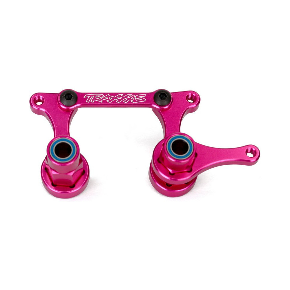 Traxxas alumínium kormánykarok rózsaszín eloxált 6061-T6, golyóscsapágyak (4) 5x8mm, összeszerelve. Pótalkatrész a Traxxas Rustler és Slash 1:10-es RC modellautókhoz.