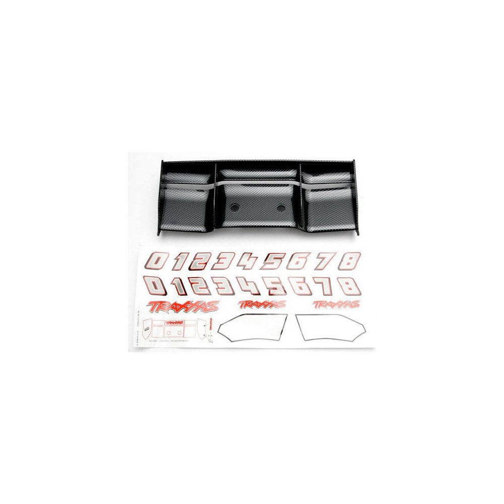 Tuning alkatrész RC modellautókhoz Traxxas E-Revo 1:8: karbon szárny, matricák