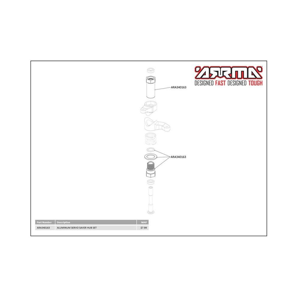 Kormányszervó kímélő hub rugós alátéttel Arrma RC autókhoz. A hub eloxált alumíniumból, a rugós alátét acélból készült. ARAC8905 rendelési számon tuningváltozat is kapható rugóelőfeszítés beállításával.