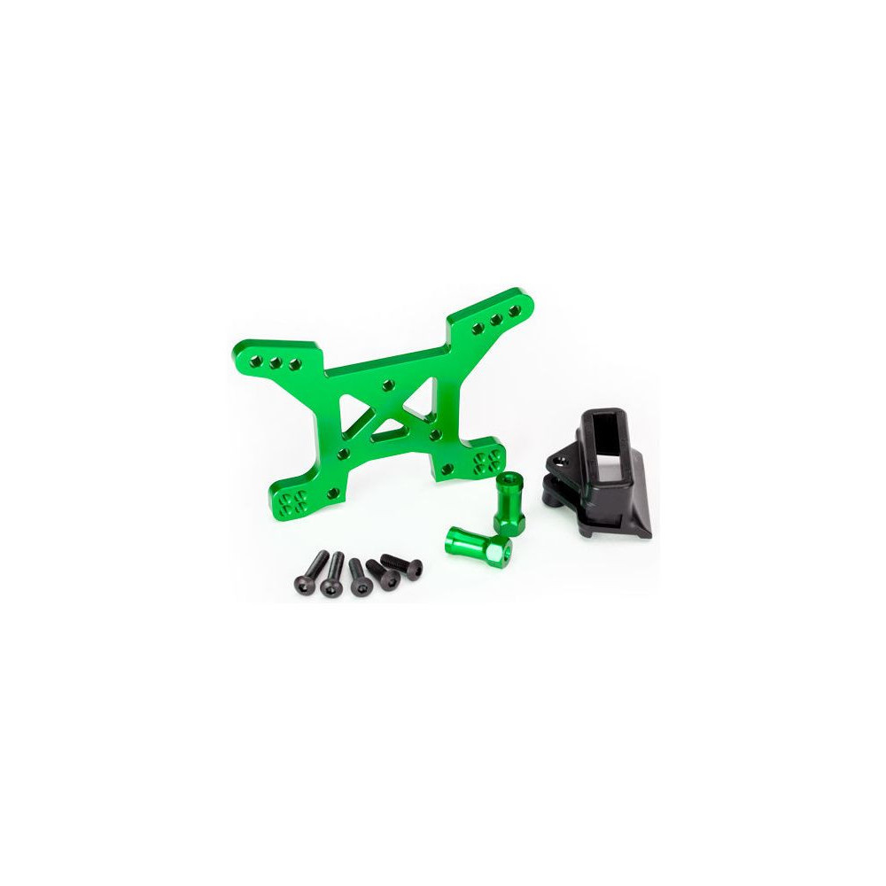 Pótalkatrész Traxxas Rustler 4WD RC modellautóhoz: zöld eloxált első lengéscsillapító torony, nagy szilárdságú 7075-T6 alumíniumból. Karosszériatartóval együtt.