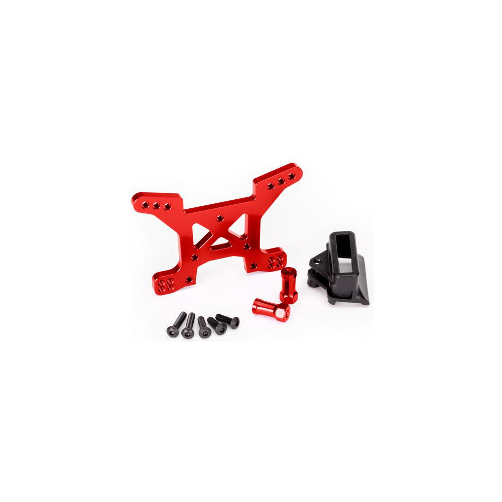 Pótalkatrész Traxxas Rustler 4WD RC modellautóhoz: piros eloxált első lengéscsillapító torony, nagy szilárdságú 7075-T6 alumíniumból. Karosszériatartóval együtt.