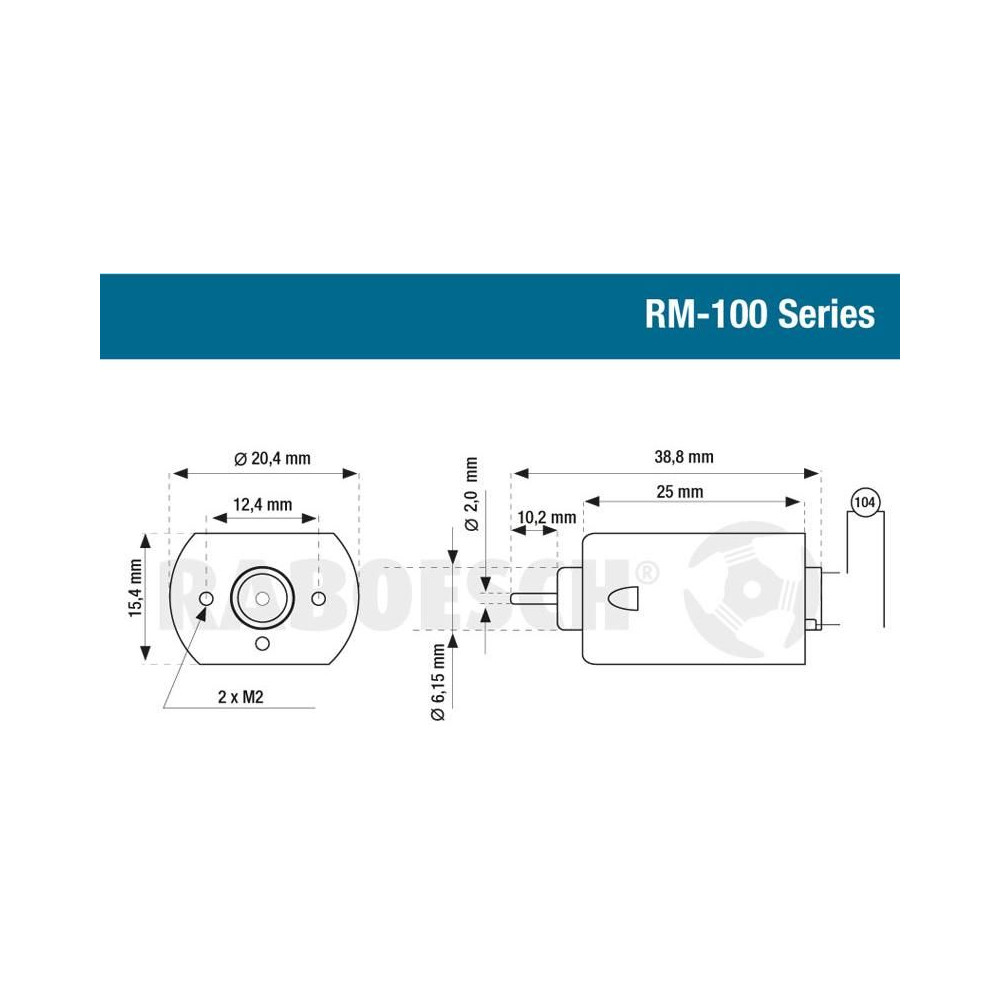 A Raboesch Blue RM-130 12V DC motor a KR-rb108-20 keresztirányú hajtáshoz készült. Tápellátás 6-12V, tengelyátmérő 2mm, tengelyhossz 10mm, súly 22g. Üresjárati fordulatszám 15000rpm maximális hatásfok 9250rpm mellett. Maximális nyomaték 44 g.cm. Teljesítmény maximális hatásfok mellett 0,33W, üresjárati áram 0,01A, áram maximális hatásfok mellett 0,6A, blokkolóáram 1,45A.