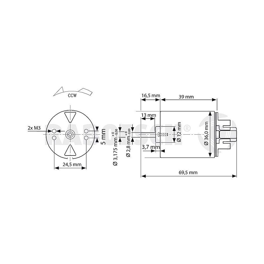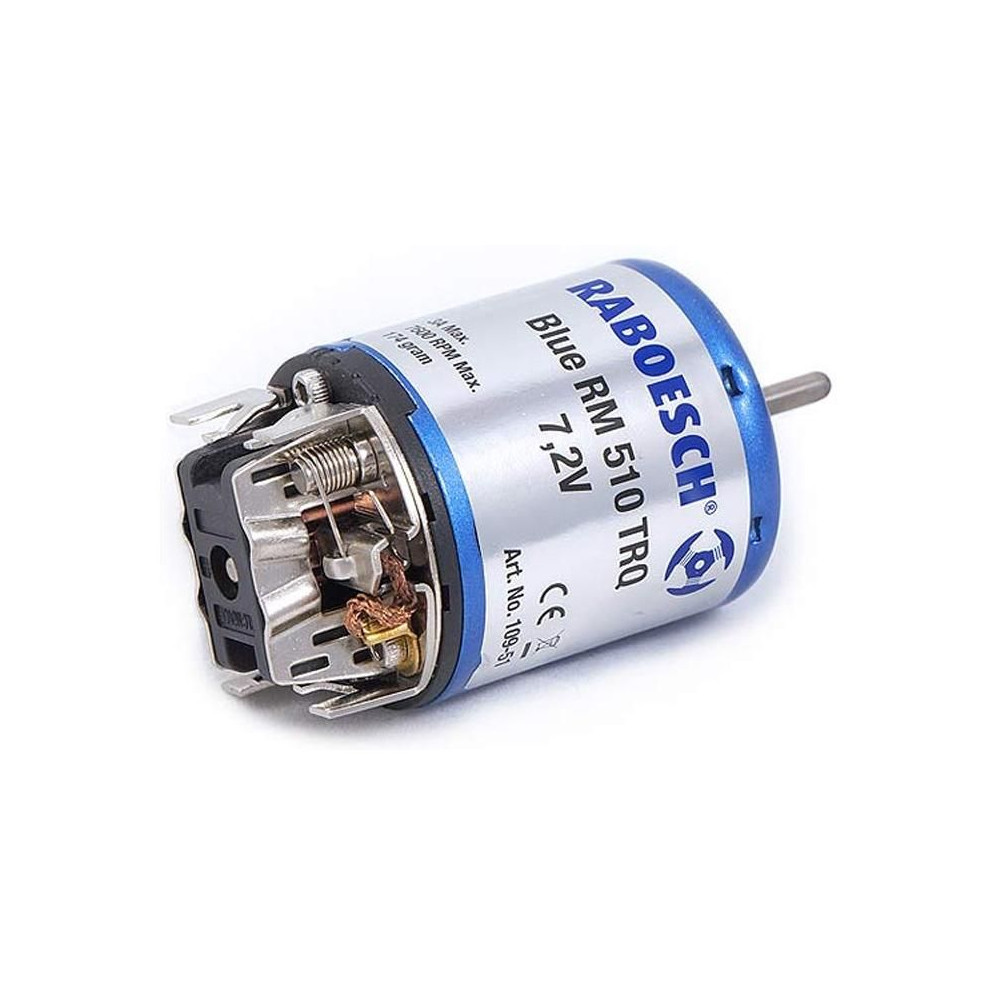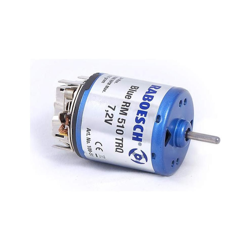 Raboesch nagy nyomatékú egyenáramú motor, kék RM-510 TRQ 7,2V. Feszültségtartomány 6-9V, tengelyátmérő 3,2mm. Súly 174g. Áram maximális kimeneti értéken 2,2A 5800rpm-nél.