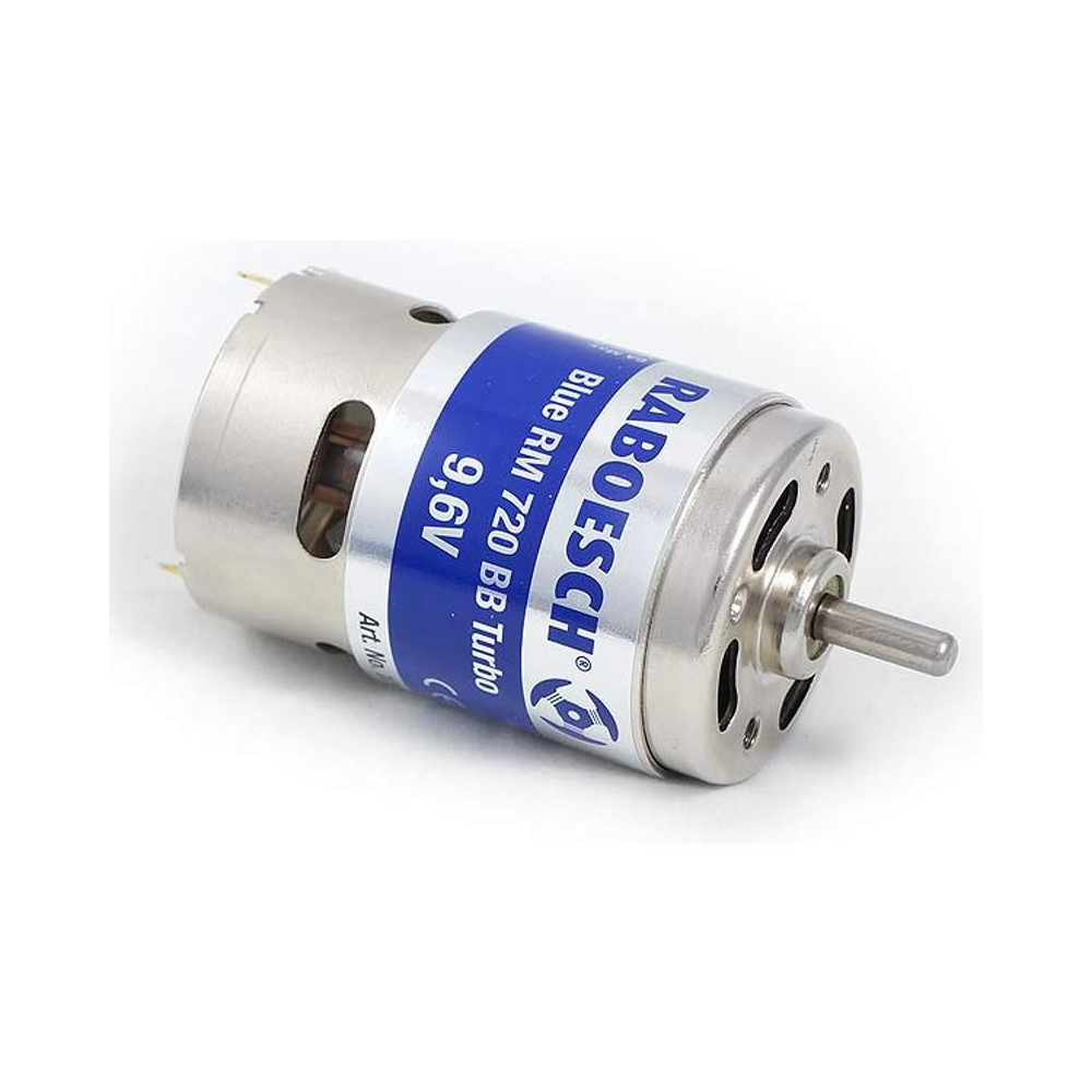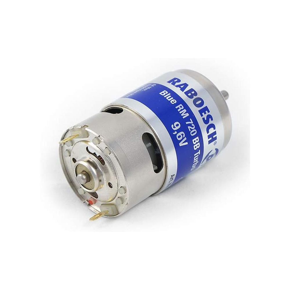 Raboesch Blue RM-720 BB Turbo 9,6V-os nagy nyomatékú egyenáramú motor 700-as méretben. Tápegység 3-9,6V, tengelyátmérő 5mm, súly 352g. Áram maximális hatásfokon 6,3A, fordulatszám maximális hatásfokon 6700 rpm.