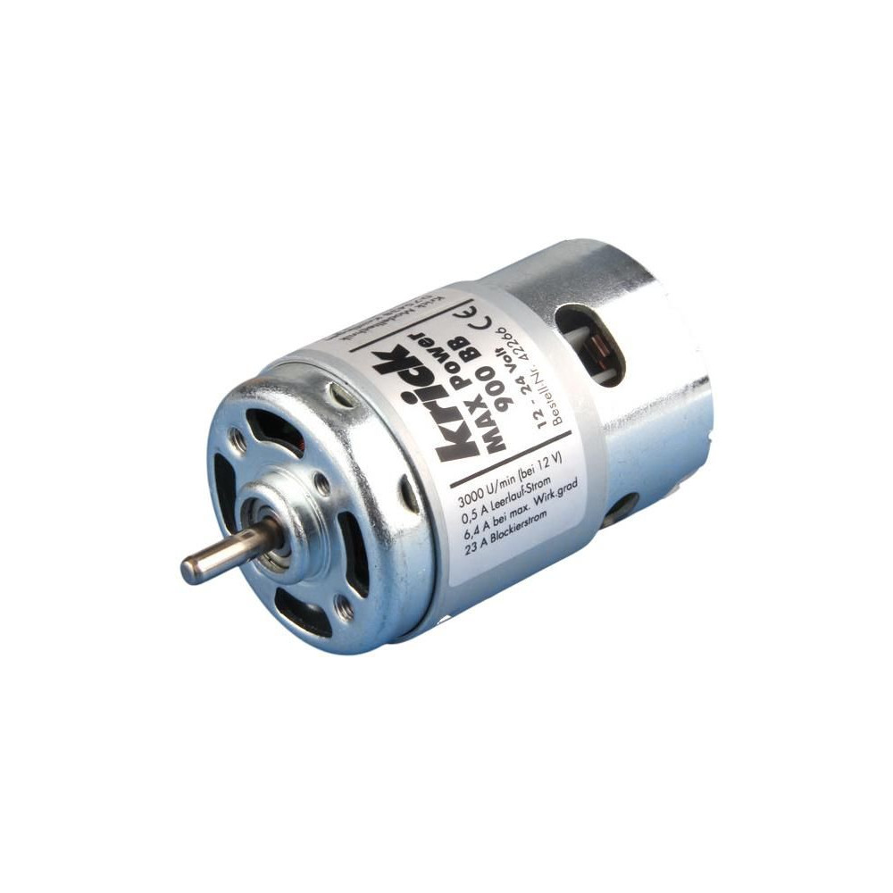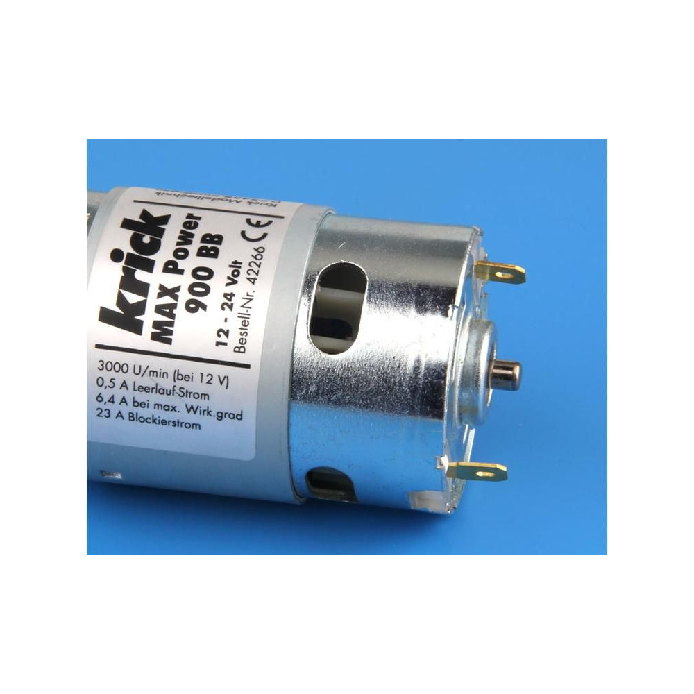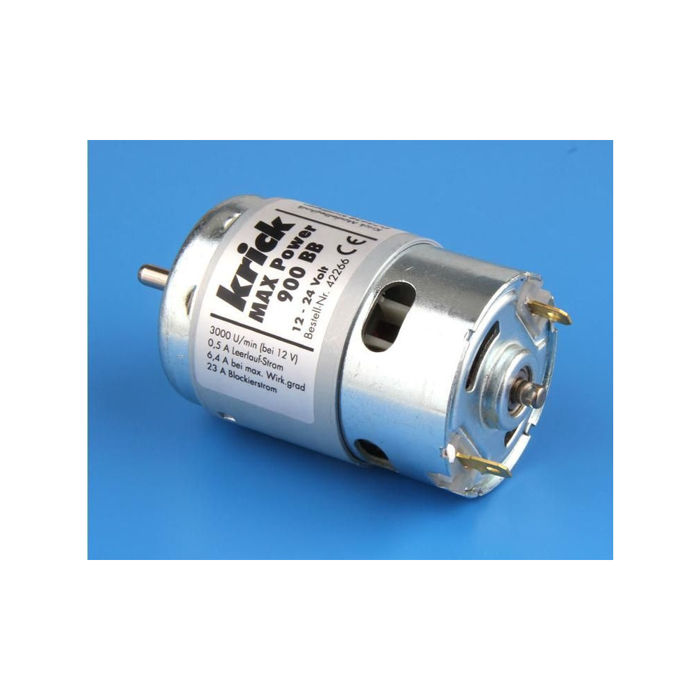 A Krick Motor MAX Power 900 BB egy 900-as sorozatú, nagy nyomatékú, alacsony fordulatszámú, golyóscsapágyas és belső ventilátorral ellátott, egyenáramú univerzális villanymotor. Teljes méret ø50 x 101 mm, ház mérete ø48 x 72 mm, tengely ø 5 mm, névleges tápfeszültség 12 V, áram max. 24 A.