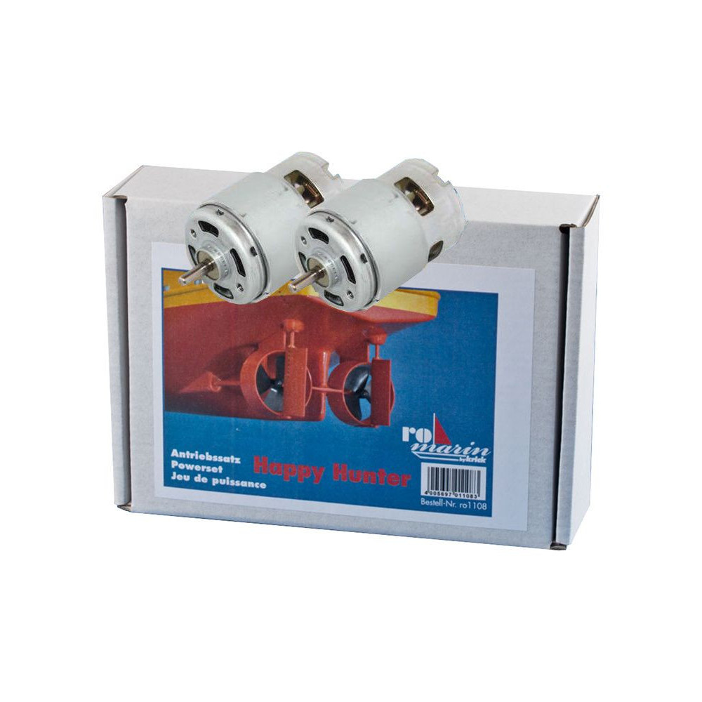 Hajtókészlet a ROMARIN Happy Hunter modellhajóhoz, 2 db MAX POWER 700 12V-os motort tartalmaz, beleértve a szuppresszív kondenzátorokat, a csatlakozókábeleket és a rögzítőcsavarokat. A nagy nyomatékú motorok közvetlenül a csónak tengelyéhez csatlakoznak.
