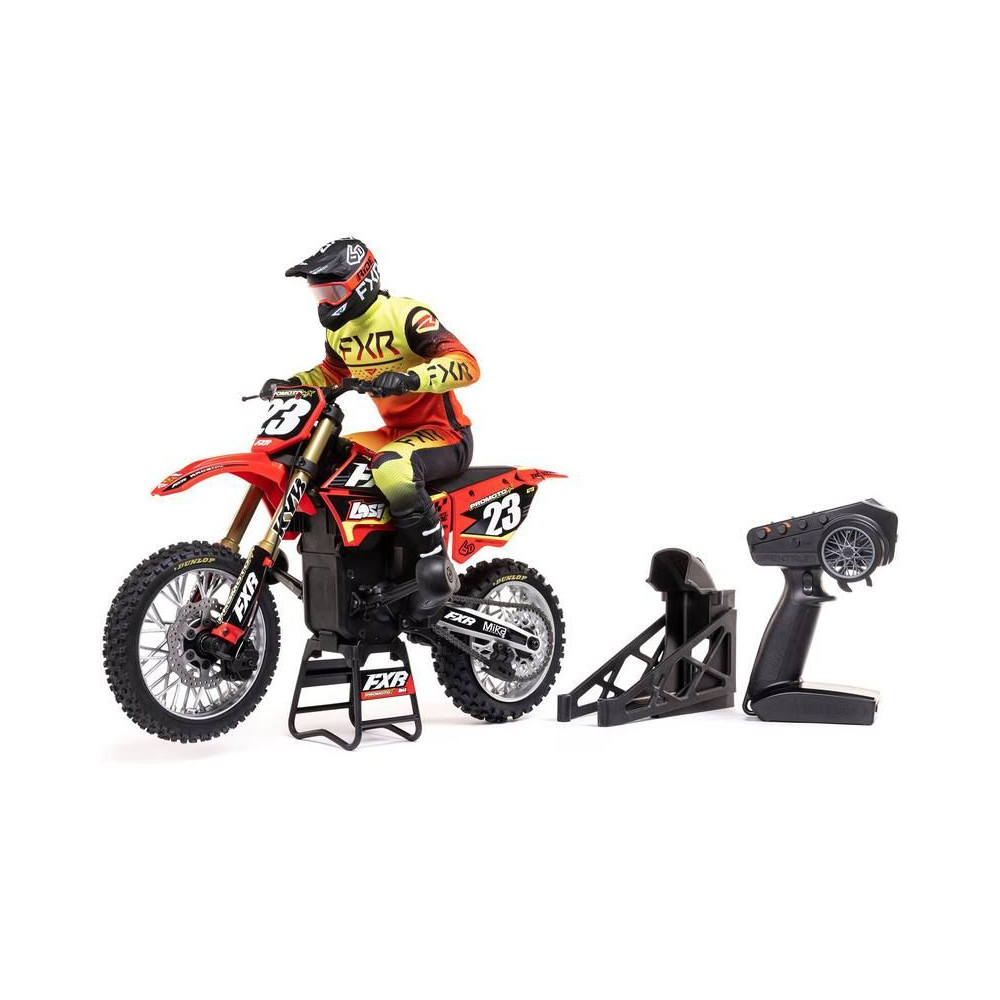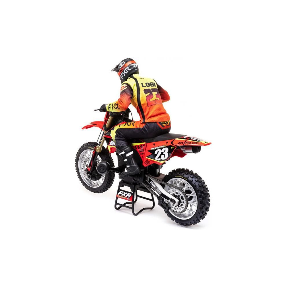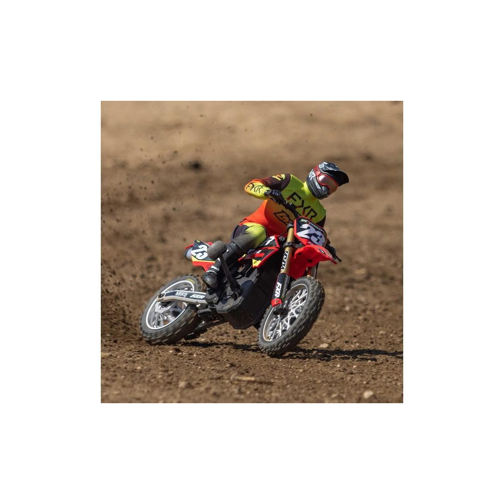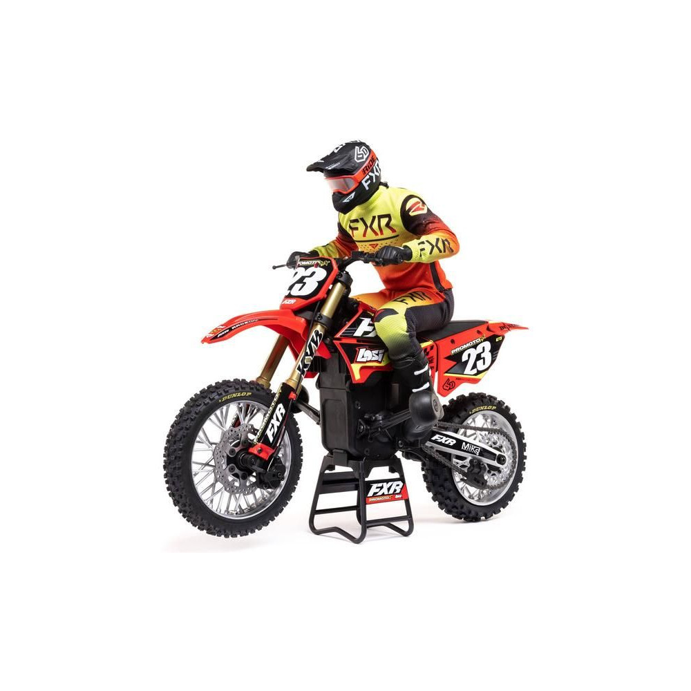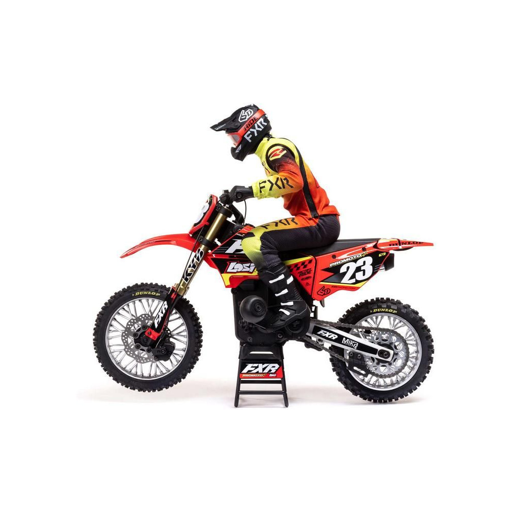 A Losi Promoto-MX cross kerékpár RC modellje 1:4 méretarányban, amely úgy néz ki és úgy működik, mint az igazi. Kiváló stabilizálás, erőteljes AC meghajtás akár 65 km/h sebességet ad a kerékpárnak, funkcionális első fék, lánchajtás, rendkívül valósághű feldolgozás.