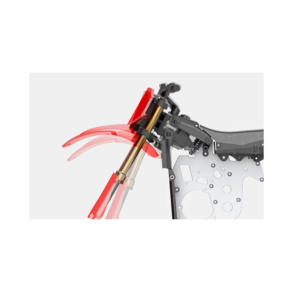 A modellmechanikai kialakítása ugyanilyen lenyűgöző. A Losi tervezőcsapata tanulmányozta a valódi motorkerékpár felfüggesztési geometriáját, hogy a Promoto-MX ugyanolyan kezelhetőségi jellemzőket nyújtson terepen és országúton egyaránt. A hátsó felfüggesztés változó merevsége kiváló tapadást biztosít, és megakadályozza az ütközést visszapattanáskor. Az egyedi, belső rugóval és lengéscsillapítóval ellátott első villa kialakítása lehetővé teszi a csillapítási merevség beállítását az olaj viszkozitásának változtatásával, valamint a hasmagasság beállítását. Az innovatív első és hátsó kerékfékrendszer, lenyűgöző fékezési erőt biztosít a kerékpárnak, és felére csökkenti a féktávolságot, ha csak a hátsó elektronikus féket használná.