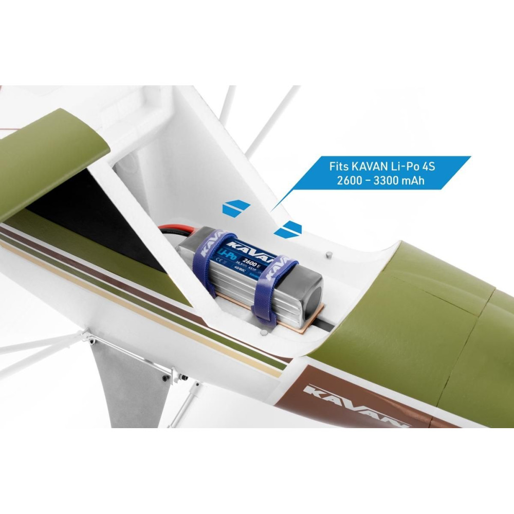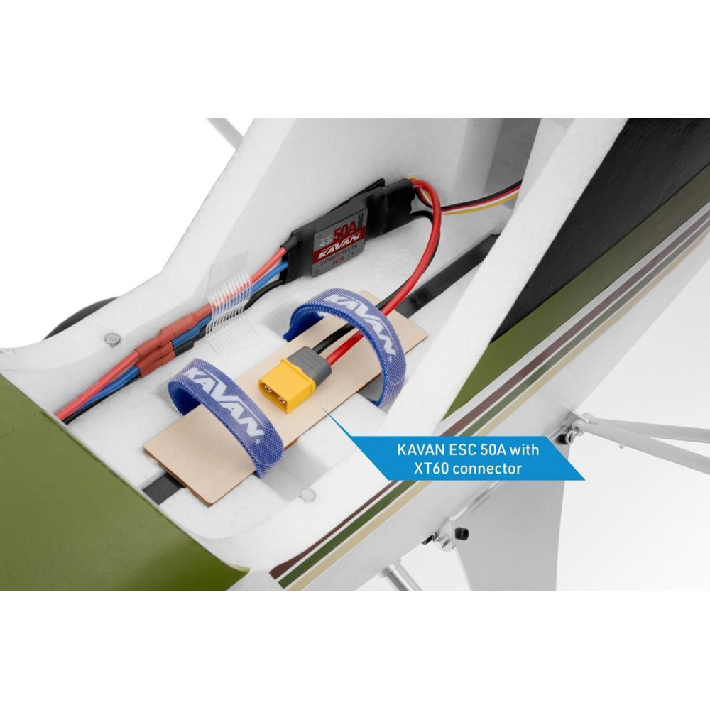 C3548-800-as osztályú kefe nélküli motor szolgál, 50 A-os KAVAN R-50SB Plus 50 A-os szabályozóval. A tápellátáshoz egy 2600-3300 mAh kapacitású LiPo quad cellára lesz szükség, legalább 30C terhelhetőséggel. Az adott típust úgy válassza ki, hogy a lehető legjobb súlyponti helyzetet érje el további súlyozás nélkül.