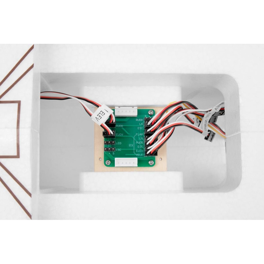 A modell vészhelyzetben történő vezérléséhez egy hatcsatornás számítógépes RC-készlettel is boldogulhatsz speciális funkciók nélkül - az alapváltozatban a kormánylapok, fékszárnyak, kormánylapátok a pilótafülke területére szerelt kábelezési lapon keresztül egyszerre csak egy csatornára csatlakoznak. A kártya biztosítja a LED-es lámpák áramellátását is. Ideális esetben persze legalább egy hétcsatornás RC-számítógép-készletet kell használni, amely lehetővé teszi a két szervóval történő független vezérlést a csónakszárnyak és a fékszárnyak között, ami a megfizethető Radiolink AT9S vagy AT10II, illetve a Futaba T6K vagy T10J modellel is lehetséges. Ebben az esetben a csónakszárny- és fékszárny-szervókat külön kell csatlakoztatni (külön megvásárolható kiegészítő kábelkészletet használhatunk). Az utasításban természetesen.