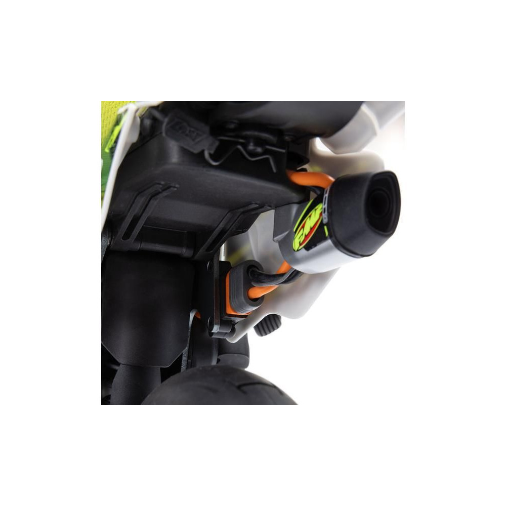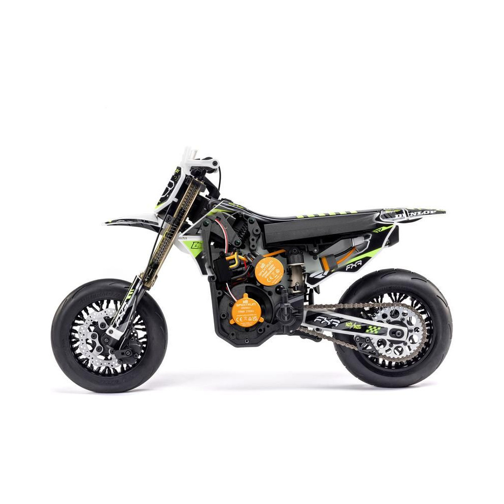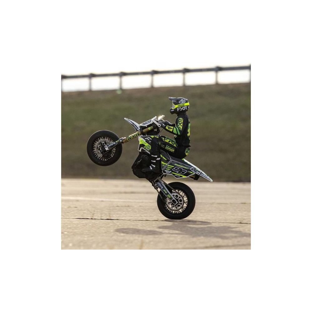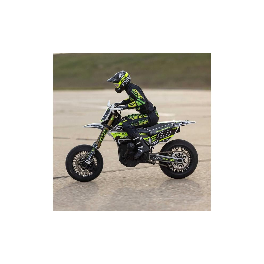 A Losi Promoto-SM supermoto motorkerékpár RC modellje 1:4 méretarányban, amely úgy néz ki és úgy is működik, mint az igazi. A váltakozó áramú hajtás akár 65 km/h sebességet, továbbfejlesztett első fékfunkciót és rendkívül valósághű képfeldolgozást biztosít. RTR Basic verzió akkumulátor és töltő nélkül .