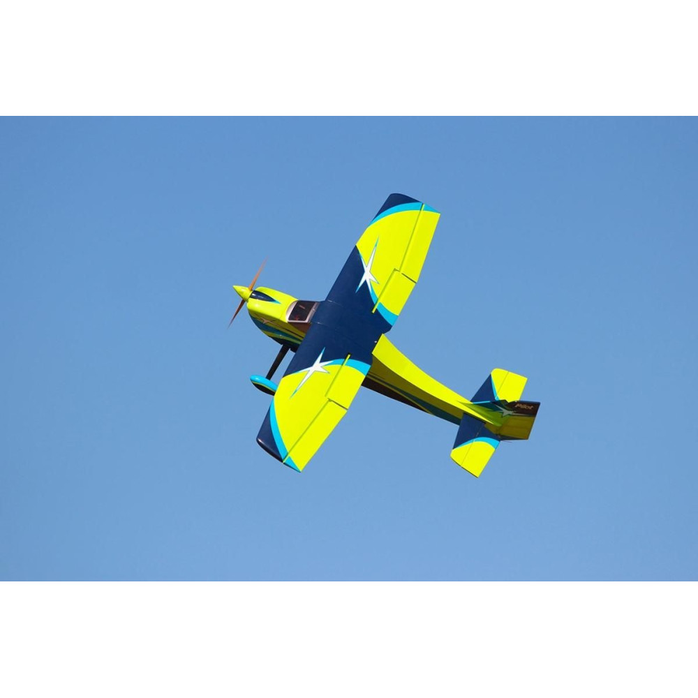 A maximális szórakozásra és egyszerűségre tervezett magasröptű tréner váratlan akrobatikus képességekkel lep meg. Az ajánlott meghajtás 30-60 köbcentis benzinmotor vagy elektromos hajtás. Vezérelt funkciók: szárny, propeller, szelepnyitó, fékszárnyak, motor.