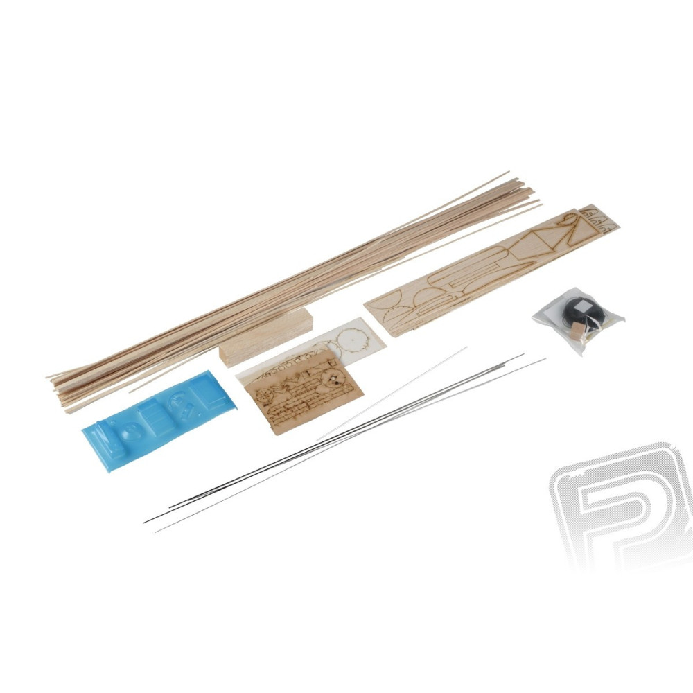 Akészlet tartalma: balsa lézervágott alkatrészek, balsa gerendák, vákuumpréselt alkatrészek (motormakett...), acélzsinór az alvázhoz és egyéb apró alkatrészekhez, könnyűszerkezetes kerekek, bevonópapír, matricás ív, építési terv.