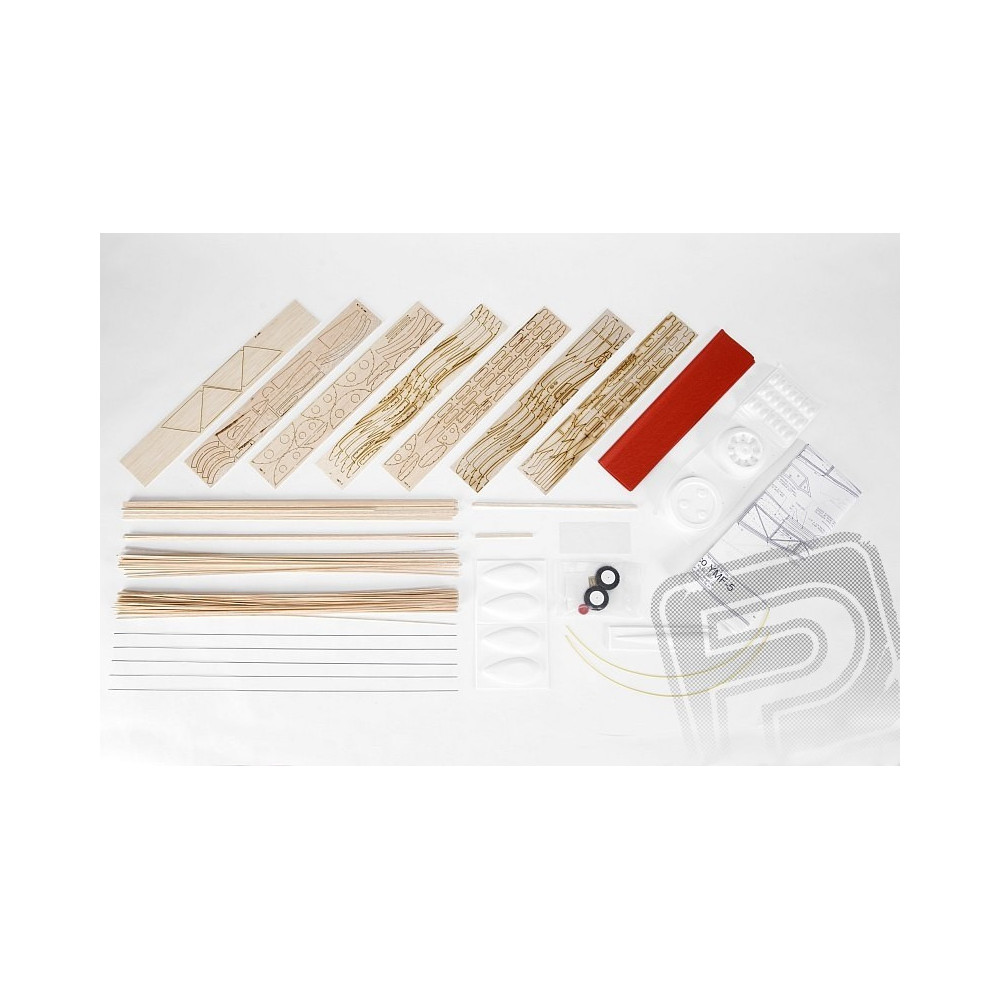 Akészlet tartalmazza: balsa lézervágott alkatrészek, balsa gerendák, vákuum-öntött alkatrészek (motorburkolat...), átlátszó műanyag lap a szélvédőhöz, acél zsinór a futóműhöz és egyéb apró alkatrészekhez, könnyű habszivacs kerekek, színes bevonópapír, matrica lap, építési terv.