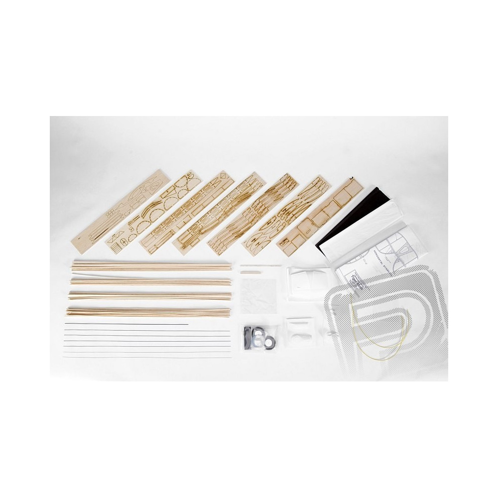 Akészlet tartalmazza: balsa lézervágott alkatrészek, balsa gerendák, vákuum-öntött alkatrészek (motorburkolat...), átlátszó műanyag lap a szélvédőhöz, acél zsinór a futóműhöz és egyéb apró alkatrészekhez, könnyű habszivacs kerekek, színes bevonópapír, matrica lap, építési terv.