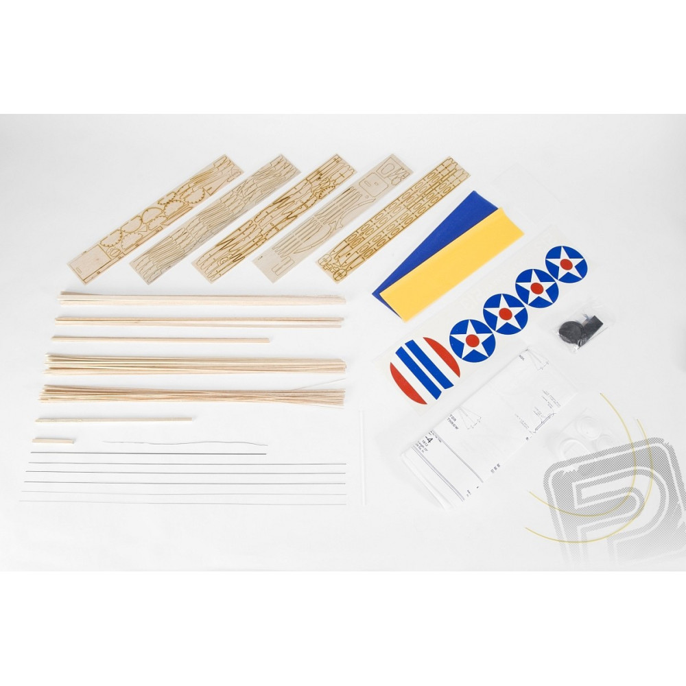 Akészlet tartalmaz: balsa lézervágott alkatrészek, balsa gerendák, vákuum-öntött alkatrészek (motorburkolat...), átlátszó műanyag lap a szélvédőhöz, acél zsinór a futóműhöz és egyéb apró alkatrészekhez, műanyag kerekek, színes bevonópapír, lapka... matricák, építési terv.
