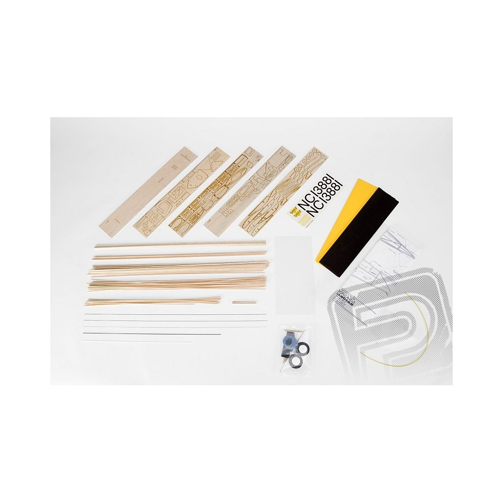 Akészlet tartalmazza: balsa lézervágott alkatrészek, balsa gerendák, vákuum-öntött alkatrészek (motorborítás, kabinborítás...), átlátszó műanyag fólia a kabin "mázolásához", acél zsinór a futóműhöz és egyéb apró alkatrészekhez, könnyű habszivacs kerekek, színes bevonópapír, matrica lap, építési terv.