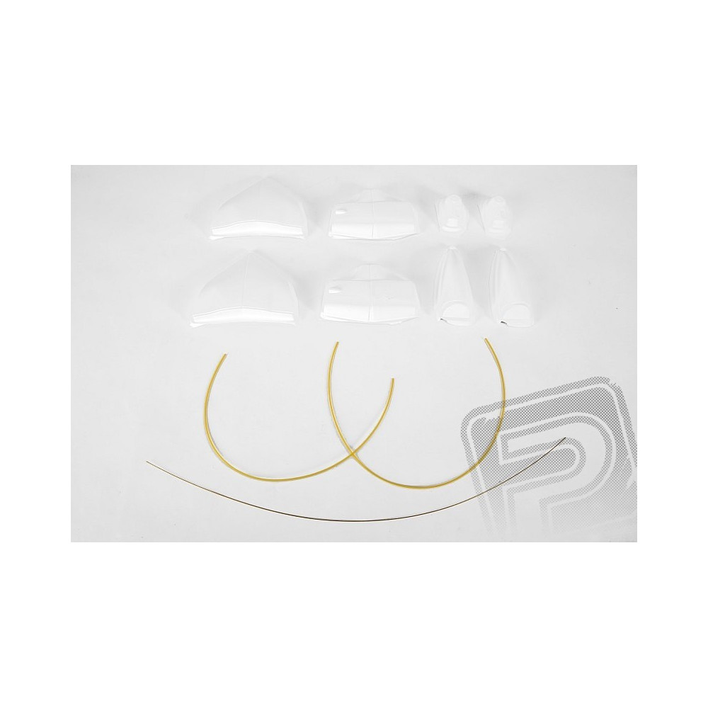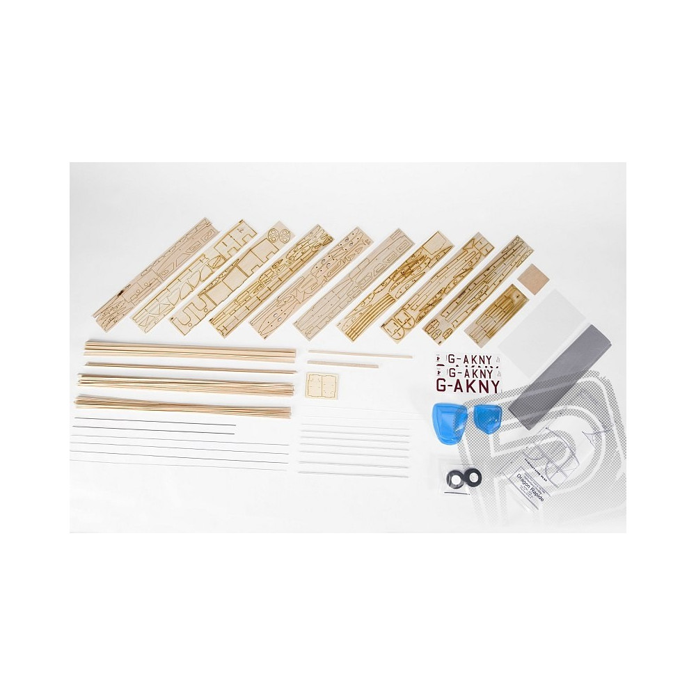 Akészlet tartalmazza: balézervágott alkatrészek, balza gerendák, vákuumpréselt alkatrészek (motorborítás, kabinborítás...), acél zsinór az alvázhoz és egyéb kis alkatrészekhez, könnyű habszivacs kerekek, színes bevonópapír, matrica lap, építési terv.