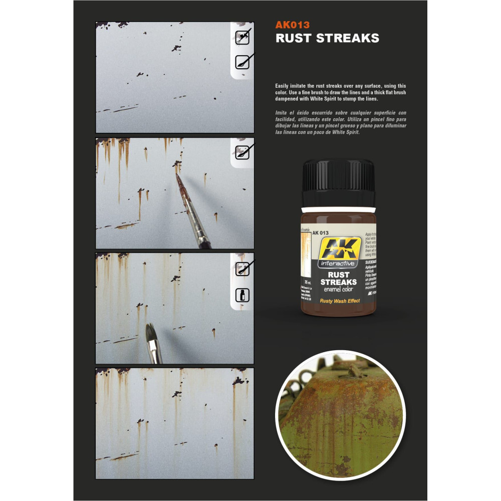 Emailové šmuhy na modelovanie. Pomocou tejto červenohnedej farby sa ľahko vytvárajú šmuhy a škvrny od hrdze a korózie. Pred použitím dobre pretrepte. Šmuhy nanášajte jemným špicatým štetcom v nepravidelných zvislých líniách z horných častí na boky a nechajte farbu zaschnúť asi 10 minút. Potom vezmite plochý štetec navlhčený v White Spirit a malým tlakom prechádzajte po predtým nanesenej šmuhe, aby ste zjemnili efekt a vytvorili prirodzený vzhľad.