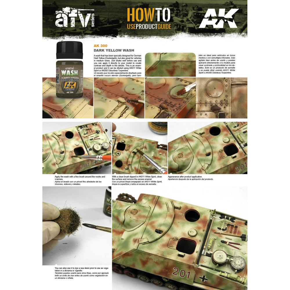 Emailový výrobok. Wash špeciálne navrhnutý pre nemeckú tmavožltú (Dunkelgelb), ale skvelý aj pre vozidlá v stredných odtieňoch. Pred použitím ho stačí dobre pretrepať a môžete ho naniesť priamo na model, aby ste vytvorili kontrast a hĺbku detailov. Prebytok odstráňte čistým štetcom navlhčeným v riedidle smaltu. Ide o smaltový výrobok, ktorý možno rozpustiť pomocou nášho White Spiritu alebo Turpentínu bez zápachu.
