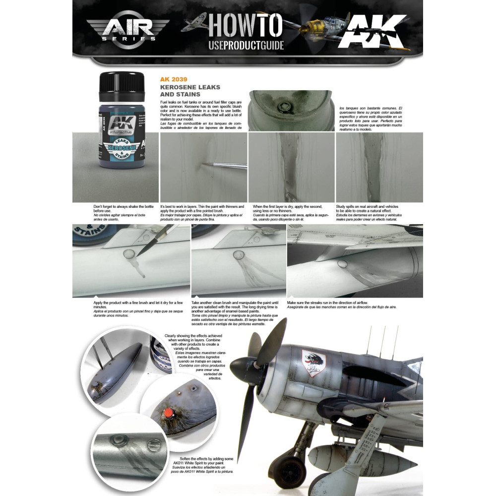 Emailový výrobok. Definitívna zmes na vytvorenie efektov rozliateho petroleja v akomkoľvek type moderných alebo klasických lietadiel. Nie je to produkt na vytváranie efektov oleja a mastnoty. Tento produkt je dobrý hlavne na vytváranie efektov rozliateho petroleja len s veľkým realizmom. Tento výrobok je email a je možné ho miešať s ostatnými našimi farbami a riediť ho naším White Spiritom.