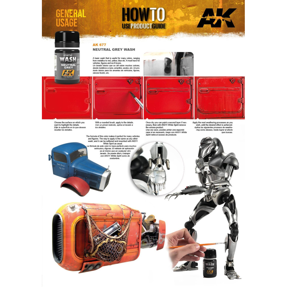 Emailový výrobok. Základný wash, ktorý je užitočný pre mnoho farieb, od metalických po červené, žlté, modré atď. Nevyhnutná výbava pre milovníkov vozidiel, figúrok a sci-fi. Základnou technikou používanou na zvetranie akéhokoľvek typu modelu je wash, klasická technika, ktorá je dodnes jednou z najpoužívanejších techník v modelárstve. Wash nanášajte po pretrepaní fľaše veľkým štetcom, aby ste vybrali detaily a vytvorili tiene. Prebytok wash sa dá ľahko odstrániť čistým štetcom a White Spiritom.