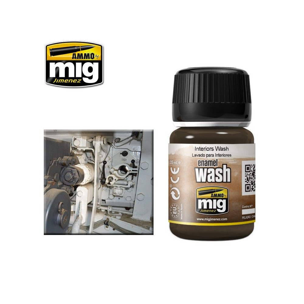 Ideálne wash na vytvorenie nahromadenej špiny a nečistôt na detailoch na svetlých farbách, ako sú interiéry. Naneste na detaily a prebytok odstráňte čistým štetcom navlhčeným v riedidle na emaily A.MIG-2018.
