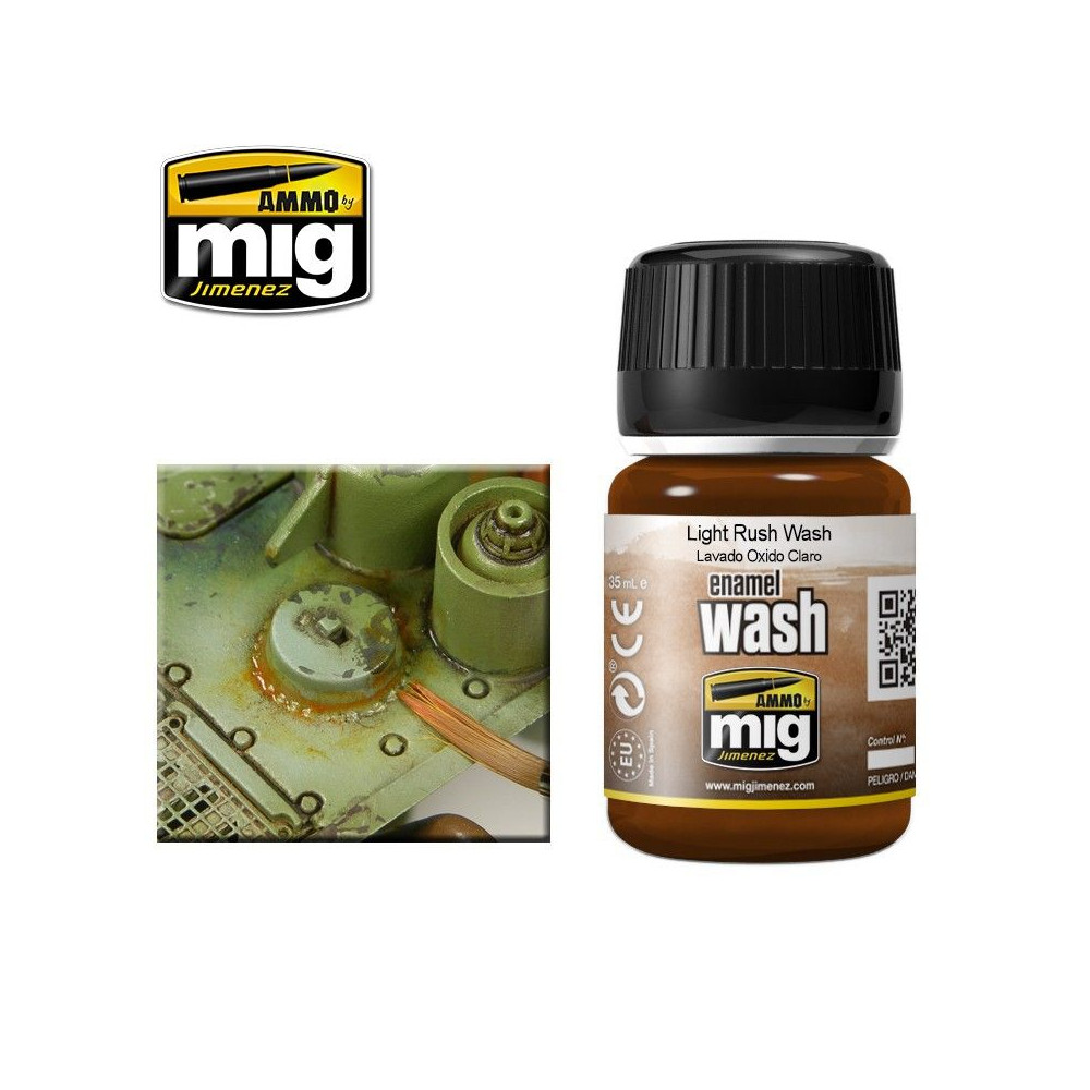 Ľahký hrdzavý wash, ideálny pre hrdzavé efekty na všetkých druhoch povrchov. Naneste na detaily a prebytok odstráňte čistým štetcom navlhčeným v riedidle na emaily A.MIG-2018.