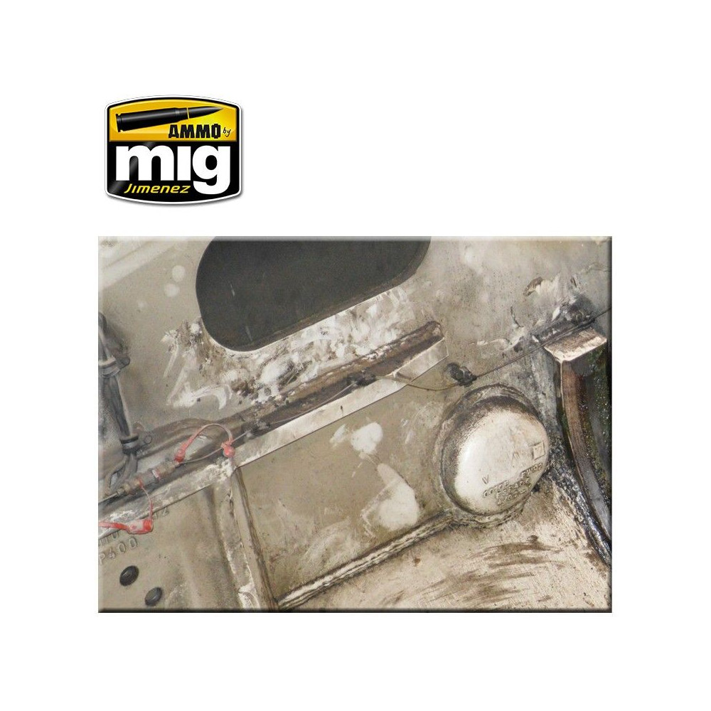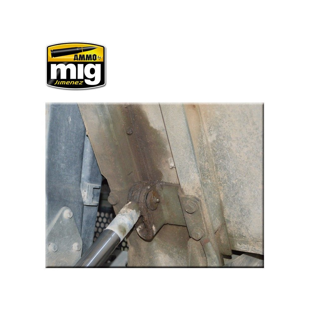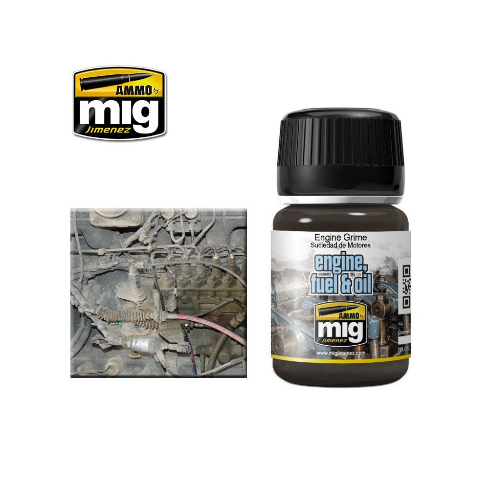 Tento tmavosivý farebný efekt je ideálny na vytvorenie špinavého vzhľadu a nahromadenej špiny dobre používaných motorov. Nanášajte štetcom alebo airbrushom a potom rozotrite čistým štetcom navlhčeným A.MIG-2018 riedidlom.
