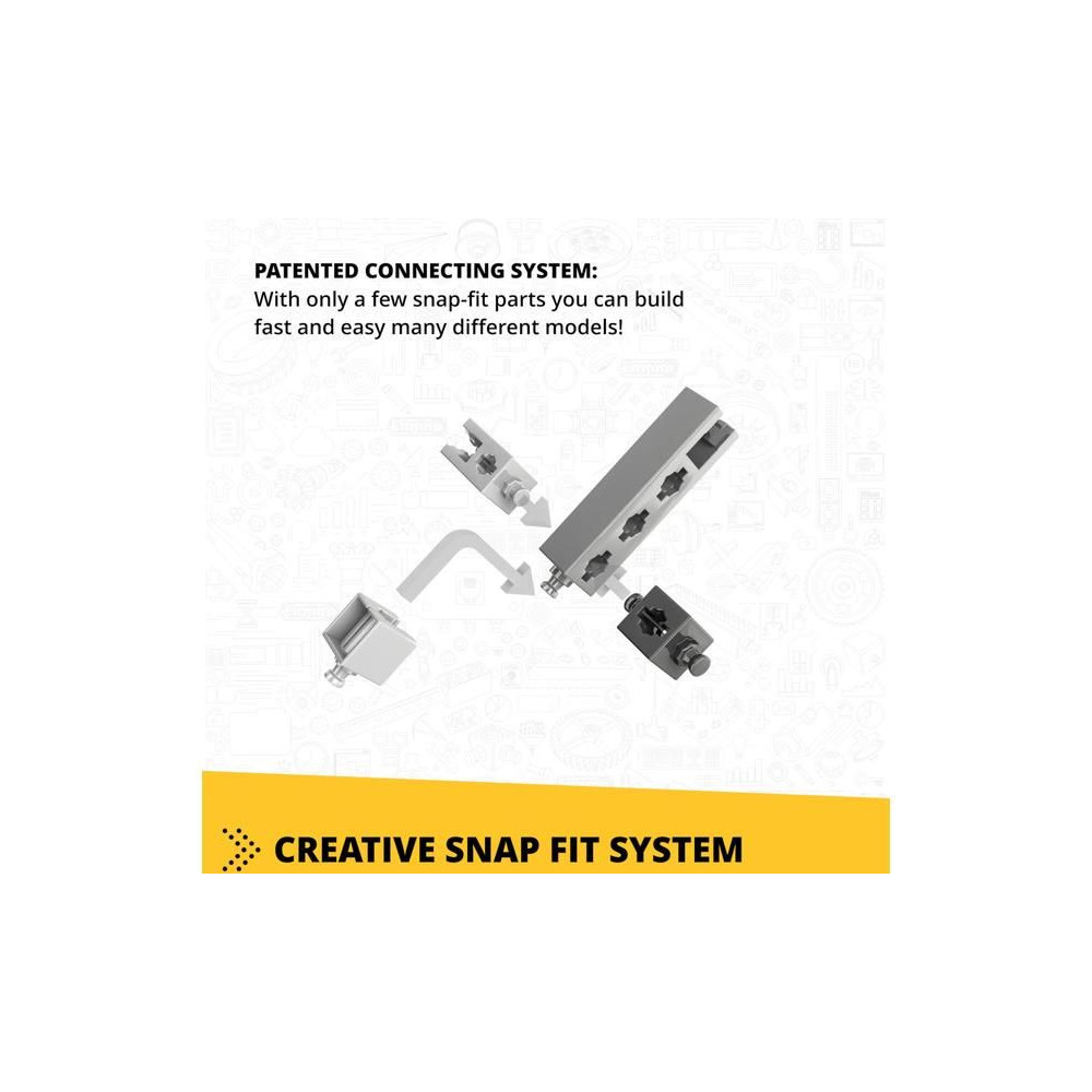 - Innovatív kialakítás: a szabadalmaztatott pattintható csatlakoztathatóság és a többirányú forgócsapok lehetővé teszik, hogy különböző szögekből, akár 6 oldalról egyszerre építkezzünk.