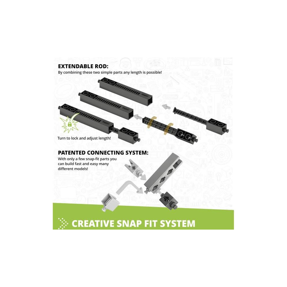 - Innovatív kialakítás: a szabadalmaztatott pattintható csatlakoztathatóság és a többirányú forgócsapok lehetővé teszik, hogy különböző szögekből, akár 6 oldalról egyszerre építkezzünk.