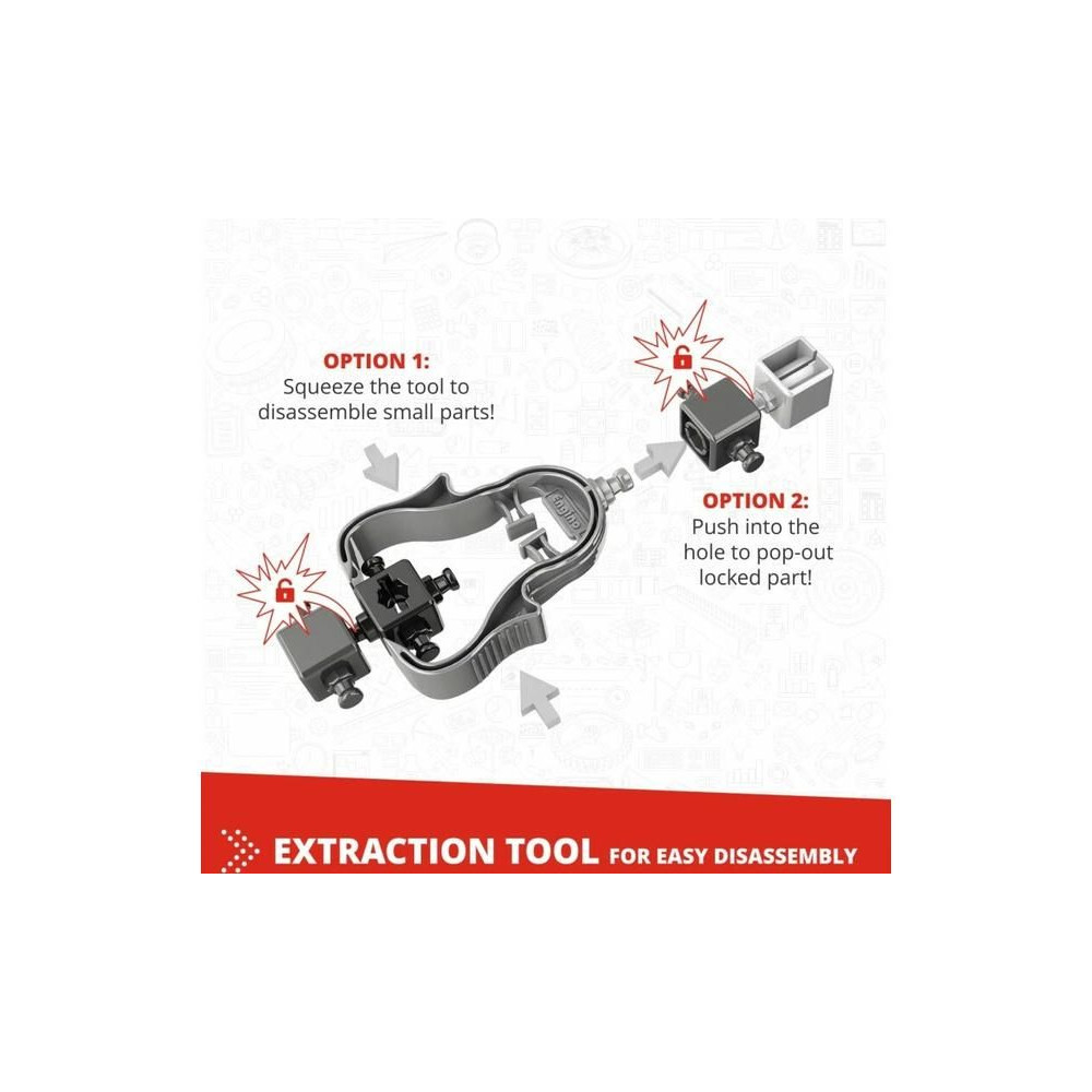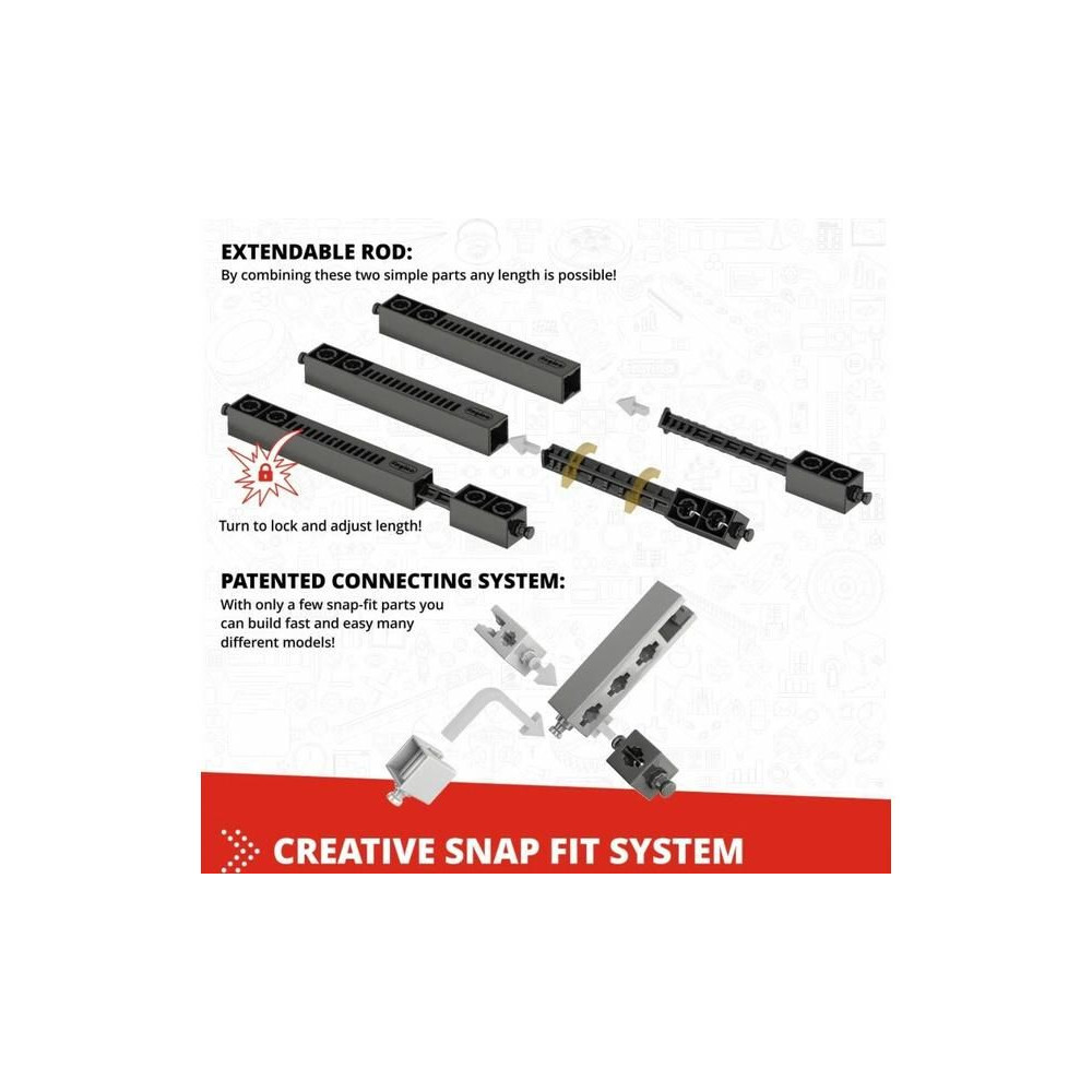 - Innovatív kialakítás: a szabadalmaztatott pattintható csatlakoztathatóság és a többirányú forgócsapok lehetővé teszik, hogy különböző szögekből, akár 6 oldalról egyszerre építkezzünk.