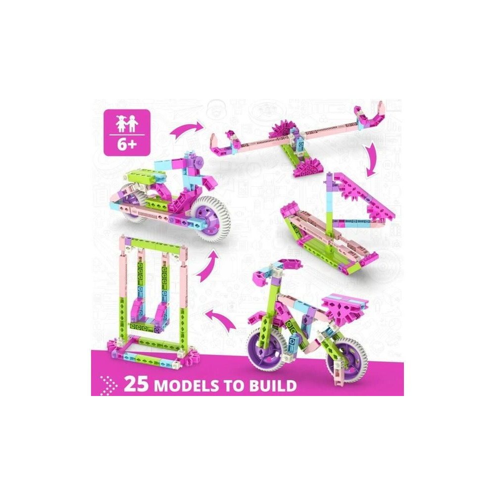 A lányoknak tervezett Engino Creative Builder Designer 25 modellkészlet arra inspirálja őket, hogy kreatívan játsszanak, és szórakoztató módon fedezzék fel a tudomány, a technológia és a mérnöki tudományok csodálatos világát. Építs 25 egyedi modellt az utasítások alapján, például kerékpárt, hintát vagy hajót. 6 éves kortól.