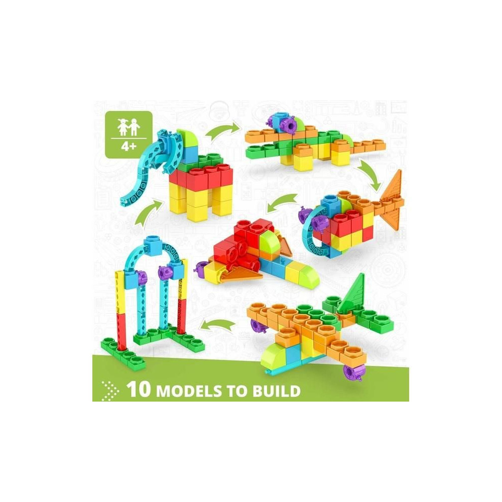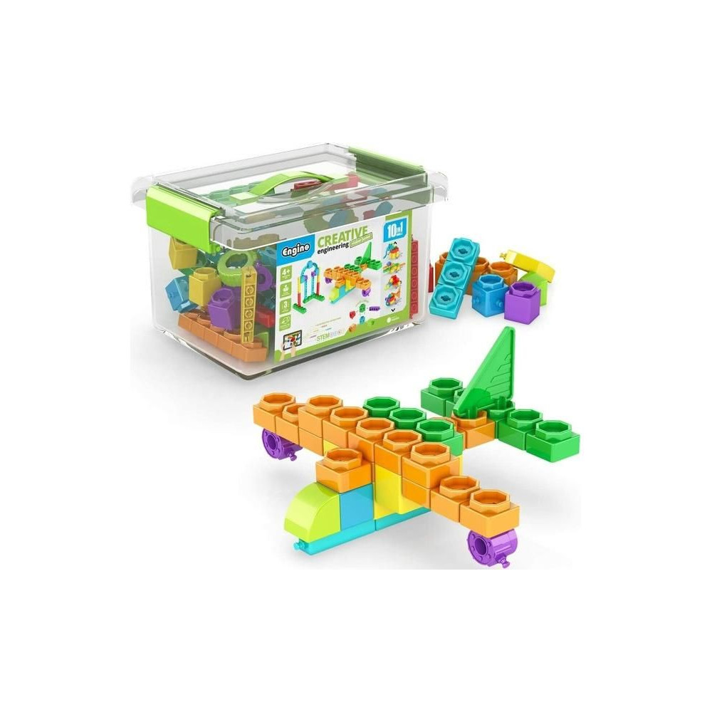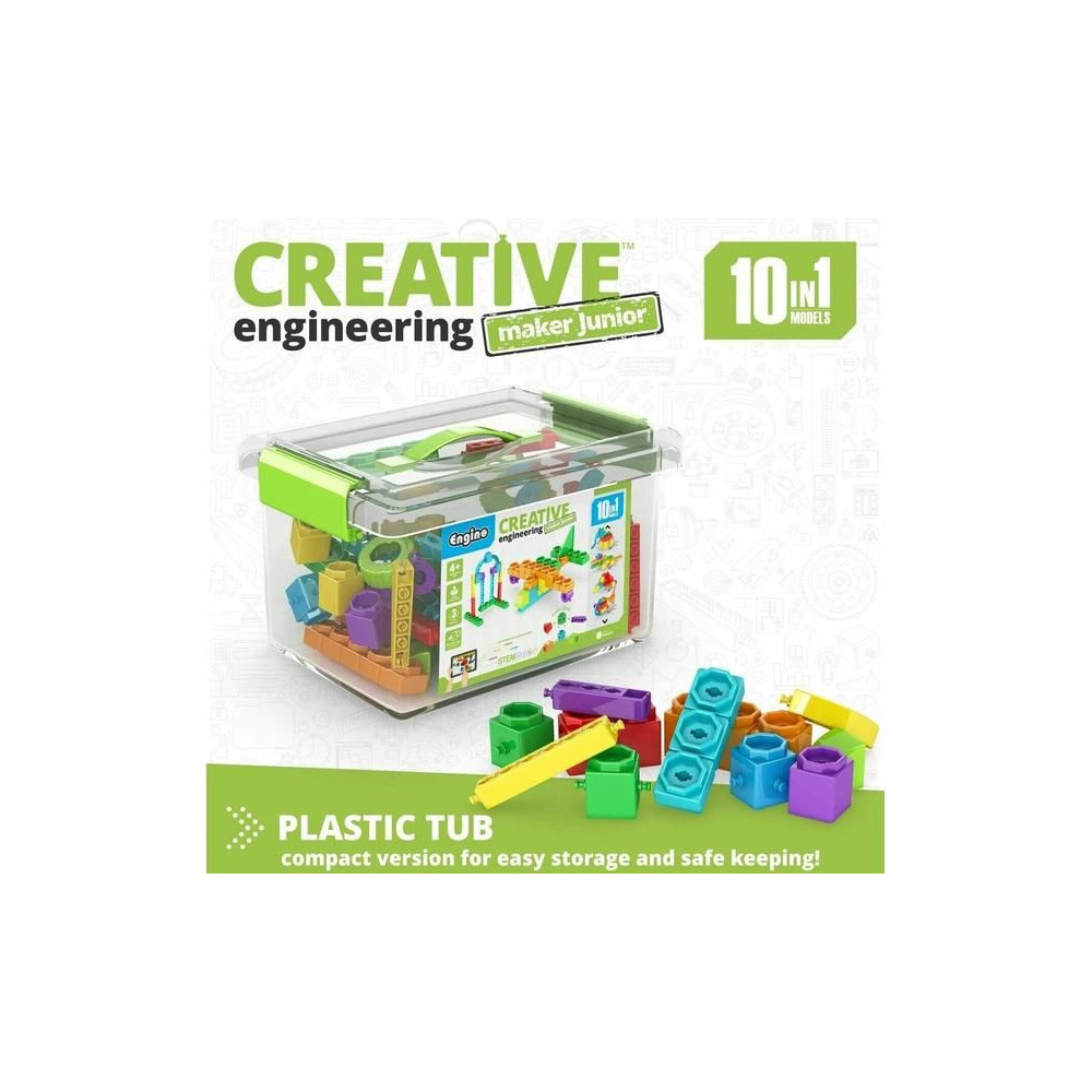 Az Engino Creative Engineering 10 models Junior egy készlet 4 éves korú gyermekek számára, amellyel 10 modellt építhetnek az útmutató szerint, és még többet a fantáziájuk szerint. A készlethez tartozik egy nyomtatott mesekönyv is, amely minden modellről tényeket tartalmaz.