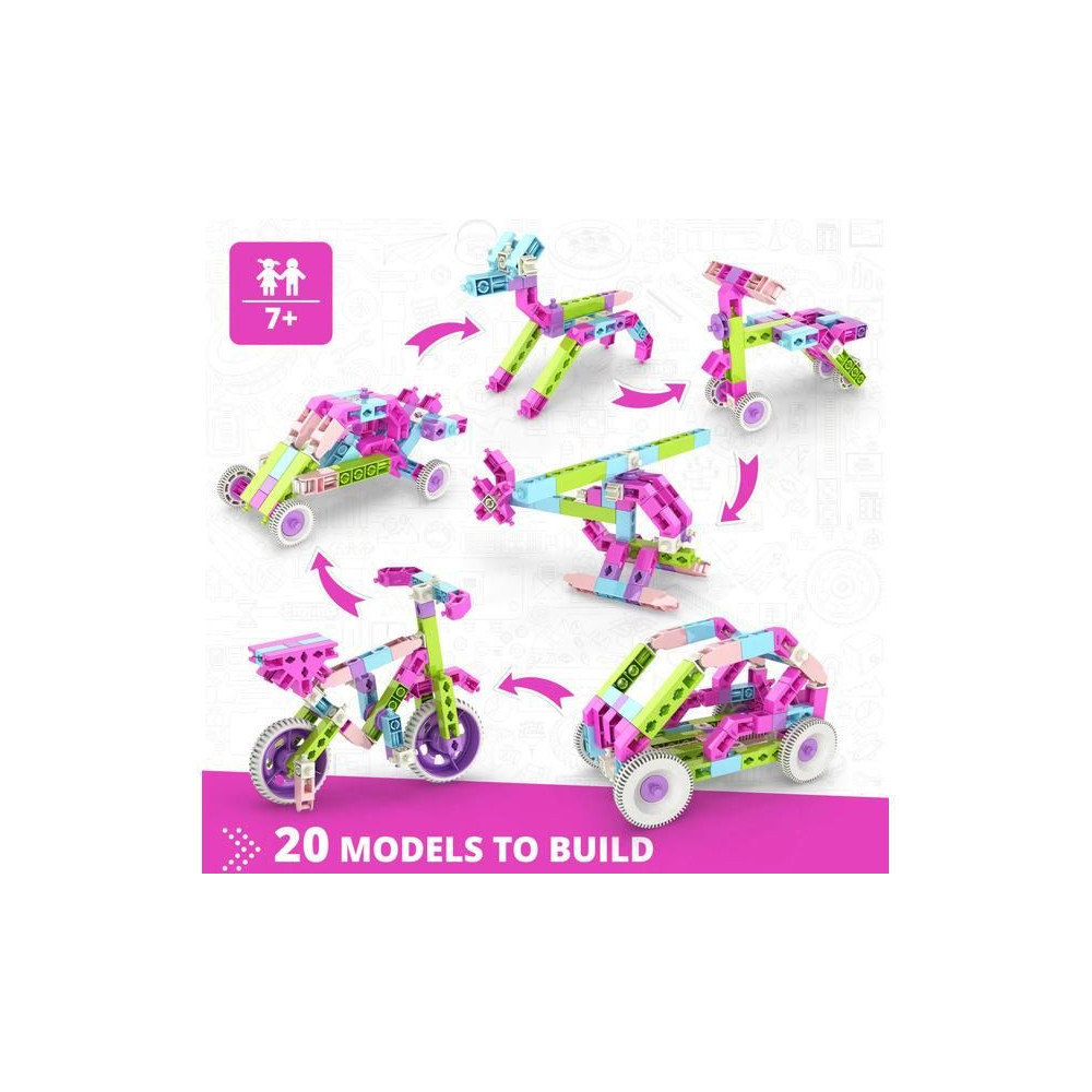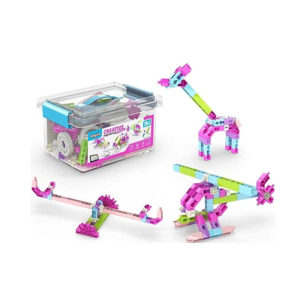 Az Engino Creative Engineering 20 modell Girl egy készlet 7 éves korú gyermekek számára, amellyel 20 modellt építhetnek az útmutató szerint, és még többet a fantáziájuk szerint. A készlet lányos színű darabokat tartalmaz, hogy a kis mérnököket modellek építésére és tervezésére ösztönözze. A darabok száma 111.