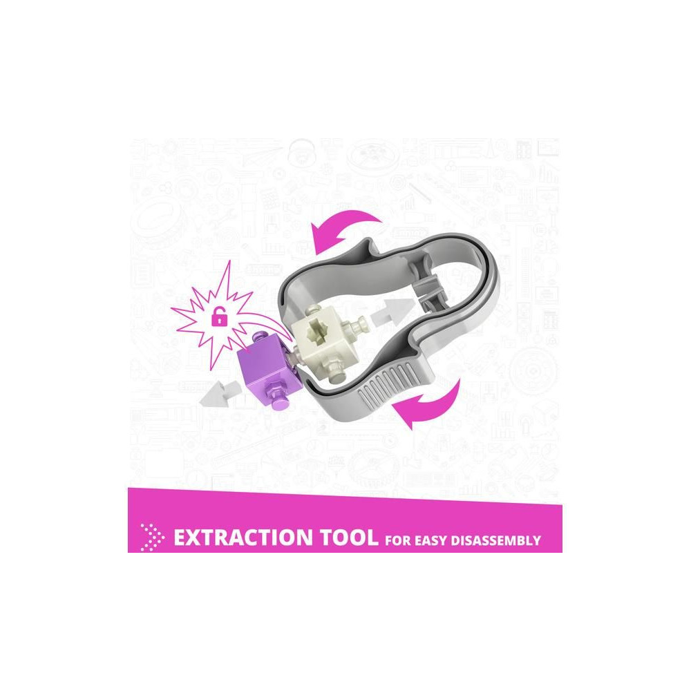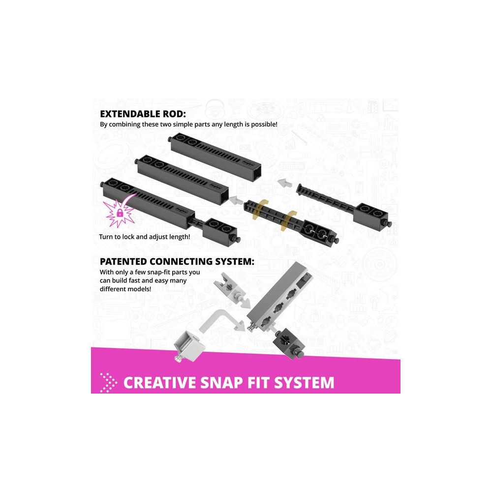 - Innovatív kialakítás: a szabadalmaztatott pattintható csatlakoztathatóság és a többirányú forgópontok lehetővé teszik, hogy különböző szögekből, akár 6 oldalról egyszerre építkezzünk.