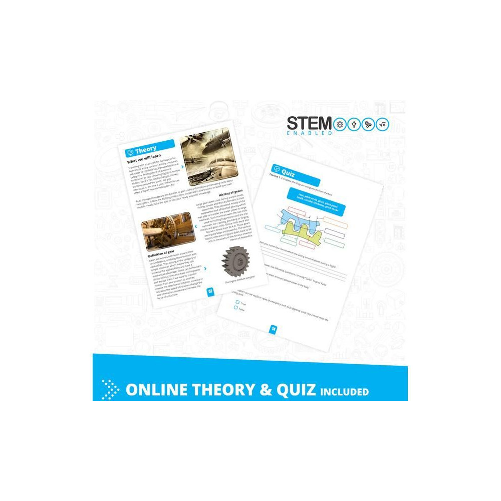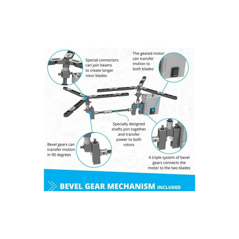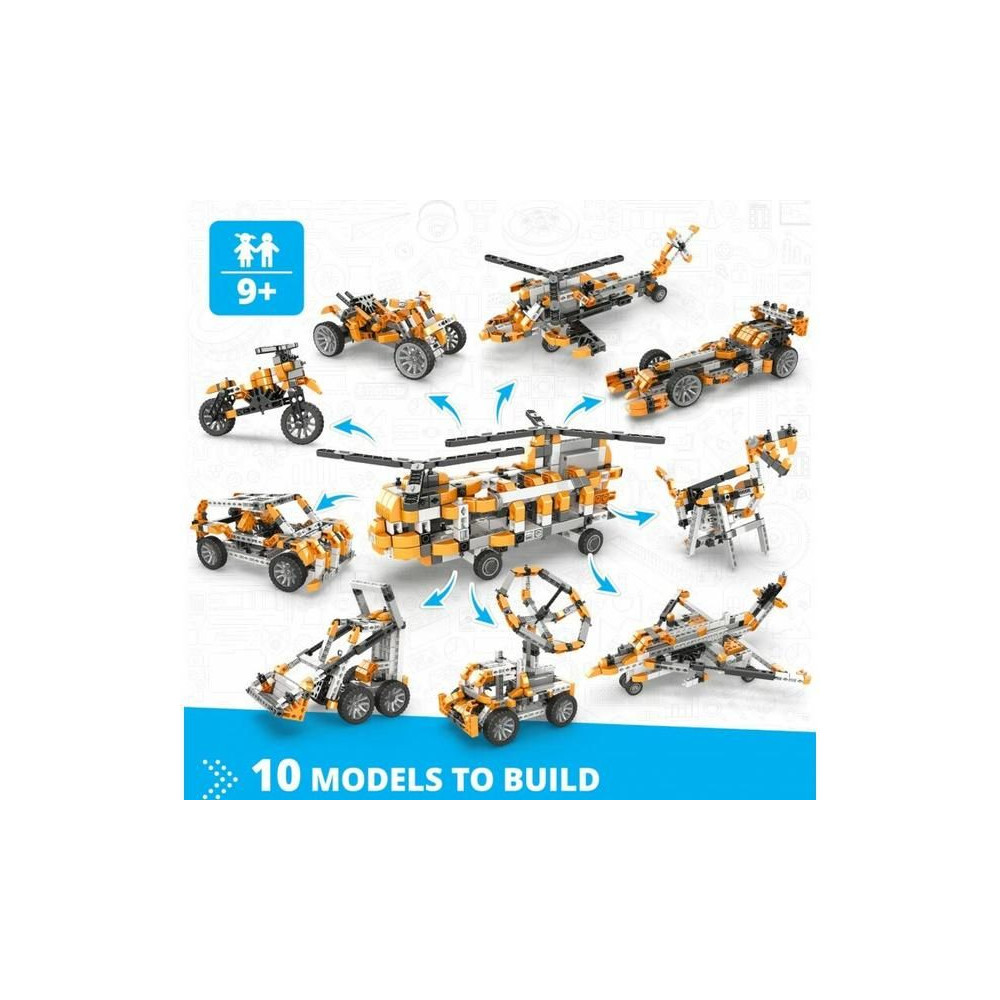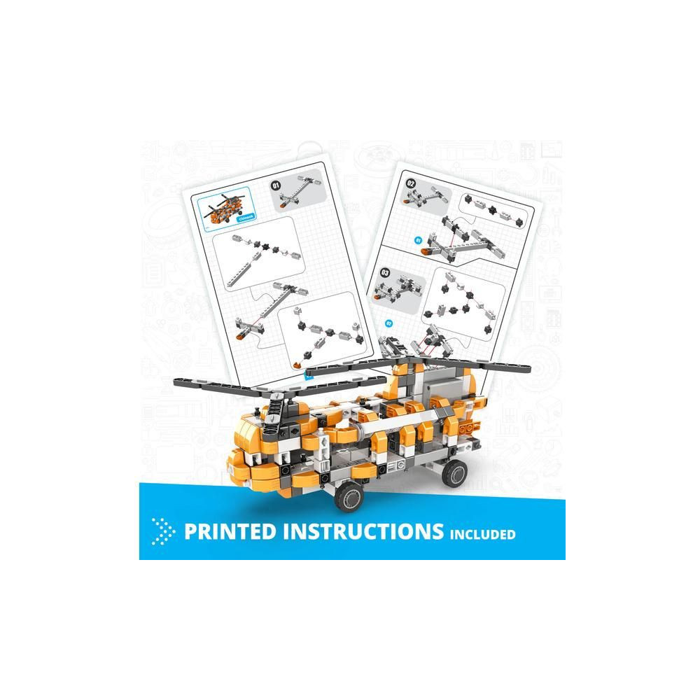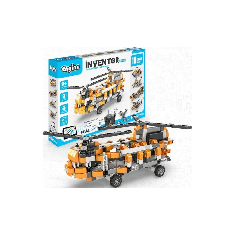 Engino Inventor motoros helikopter készlet, 10 különböző modell építhető, mint például autók, helikopter, motorkerékpár, építőgépek, kutya, stb. A modellek mozgásban tartásához egy kapcsolóval ellátott, elemmel működő meghajtóegységet tartalmaz. Útmutató a pontos összeszerelési eljárással és a mechanizmusok funkcióinak leírásával.